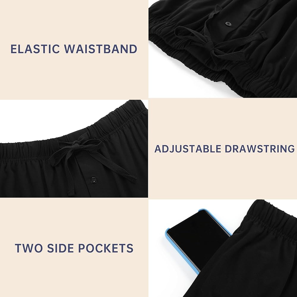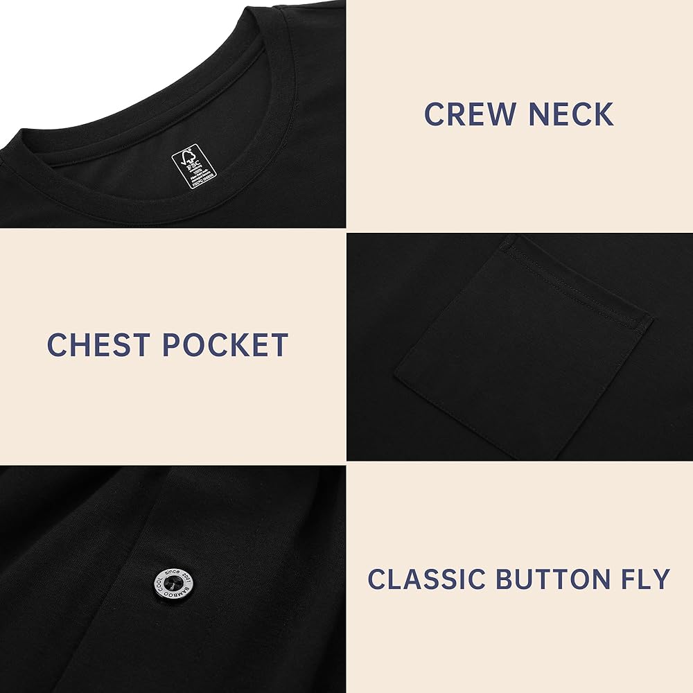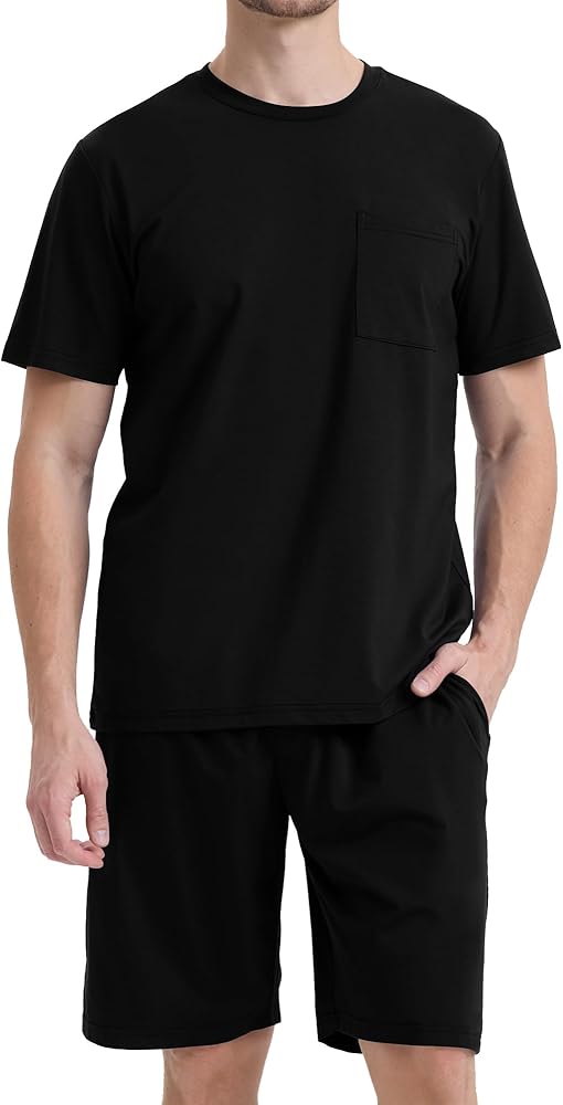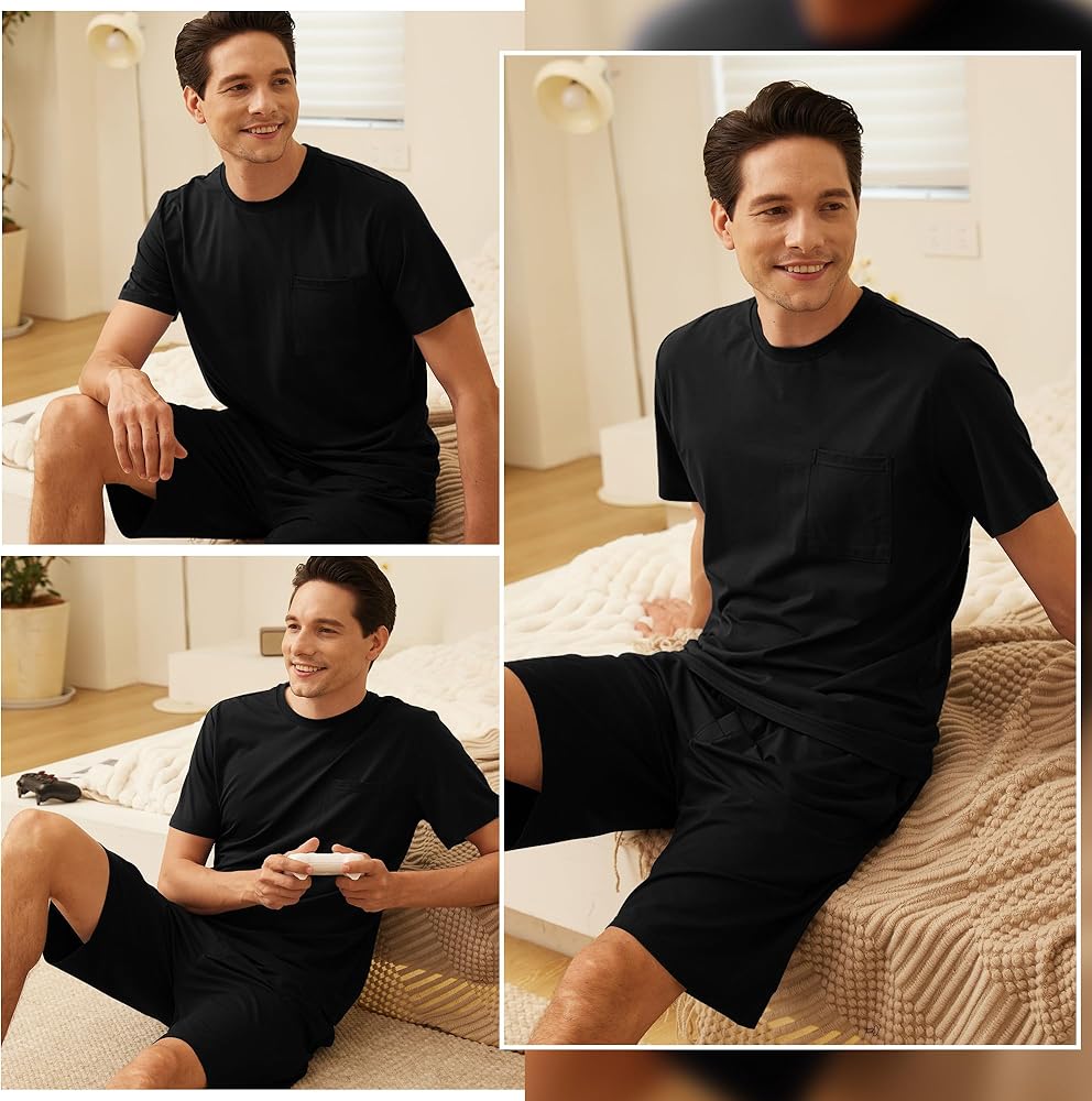 【Features】Men Sleep Short Set is a Two-piece lounge sleepwear. It contains a tee and shorts. Sleep Top Tee: Short sleeves crew neck design and classic left chest pocket. Sleep Bottom Shorts: two side pockets, Crotch front button opening, elastic waistband, and adjustable drawstring. Two side pockets, roomy enough to hold your phone and wallet when it is necessary.