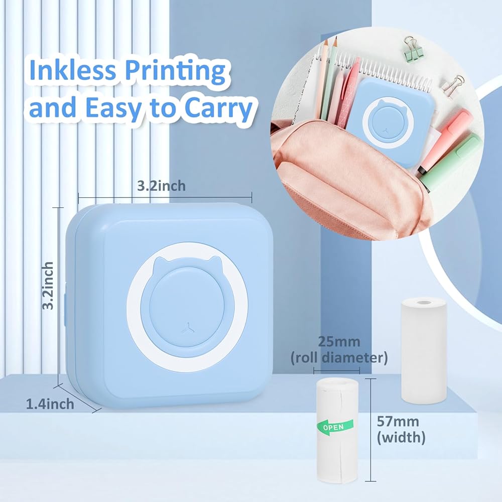 AURTEC Mini Thermal Printer, Portable Wireless Bluetooth Inkless With 3 Rolls of Sticker and 3 Rolls of Thermal Paper, Compatible With Android/iOS, Pocket for Memo and More Blue