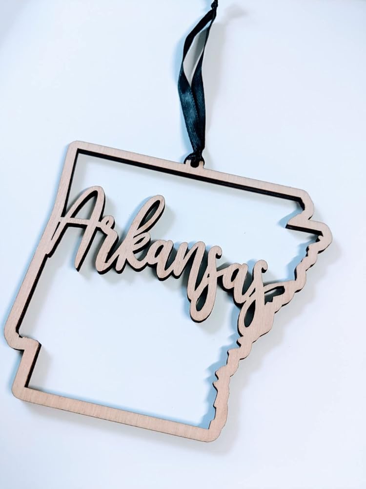 Arkansas Christmas Ornament. A modern twist on the typical state shape! Ornament your tree this year to achieve a rustic Christmas look. Made from laser cut wood and black ribbon, Measures 4.5"l x 4" h x 0.25-inch depth.