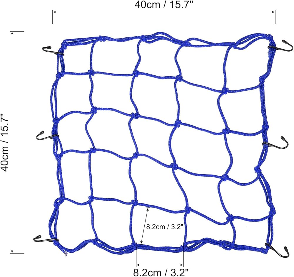 Material: Nylon, Rubber; Size: 40cm x 40cm/ 15.7" x 15.7" (L*W); Grid Size: 8cm x 8cm/ 3.2" x 3.2" (L*W); Packing List: 2 x Cargo Net
