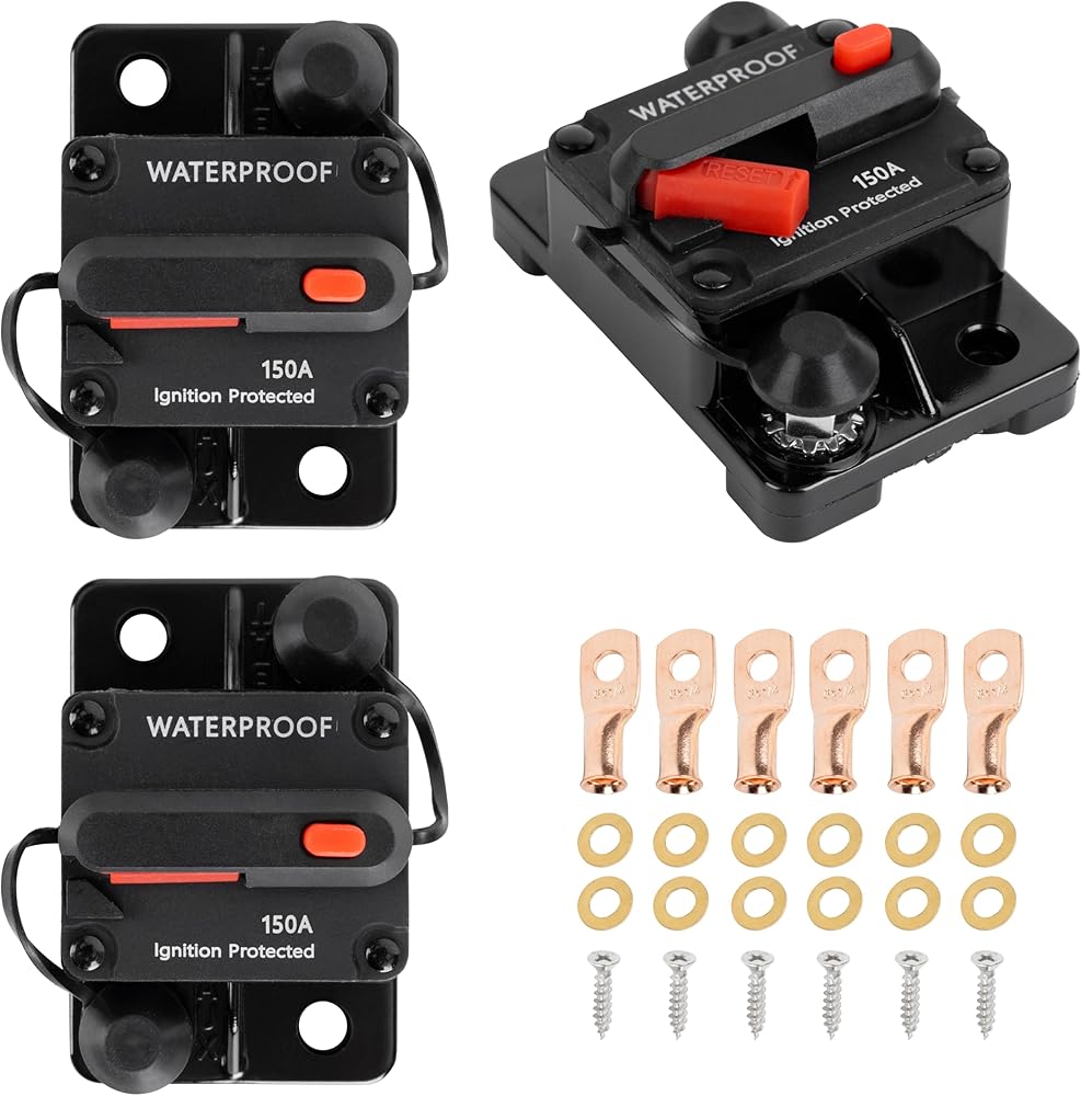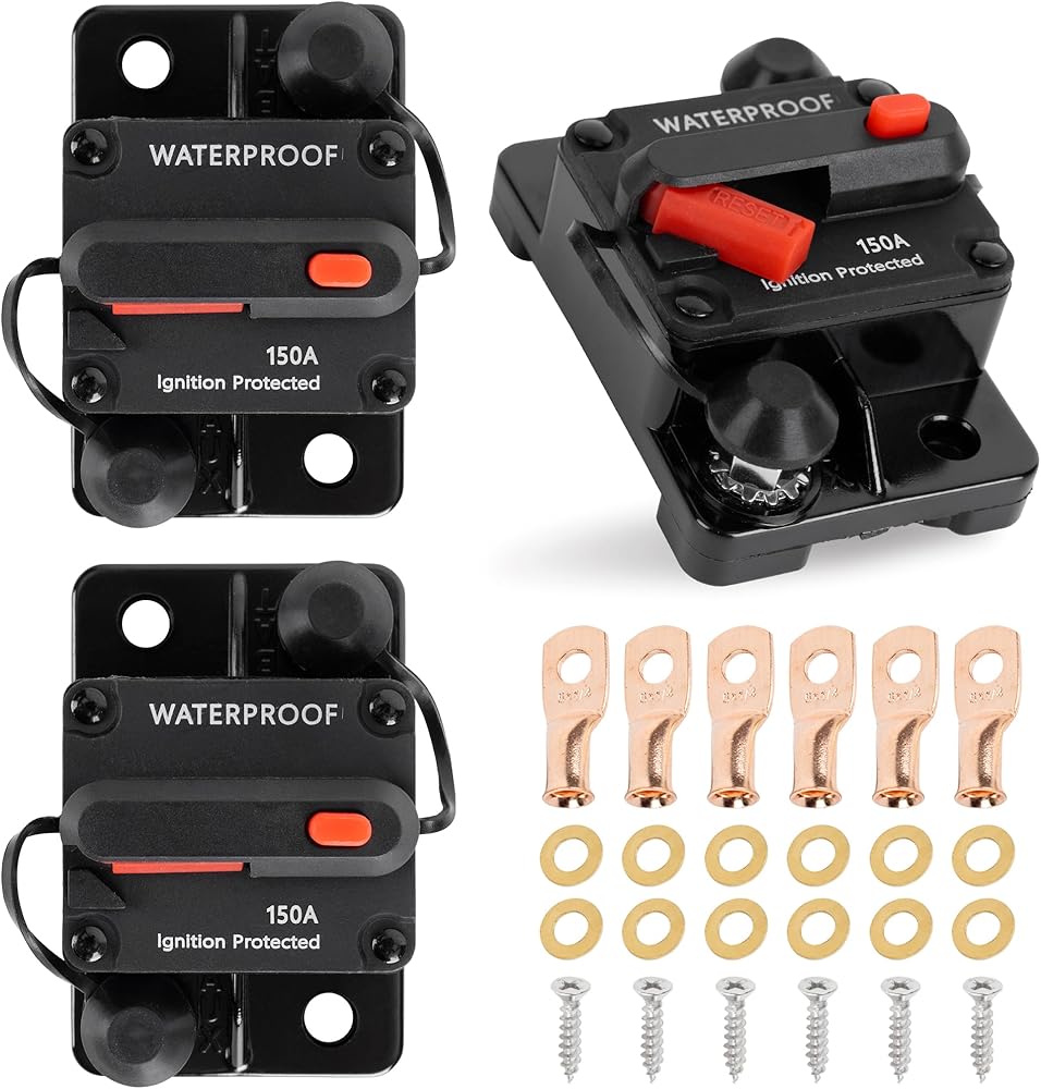✅ GREAT VALUE PACKAGE: included 3 x 150Amp Circuit Breakers; 2 x Wire Lugs; 4 x Copper Washers; 2 x Self-Tapping Screws. (Item Dimensions LxWxH: 2.91 x 1.9 x 1.44 inches. Voltage rating: 12V-48V DC. Interrupt Capacity: 3000A @ 48V)