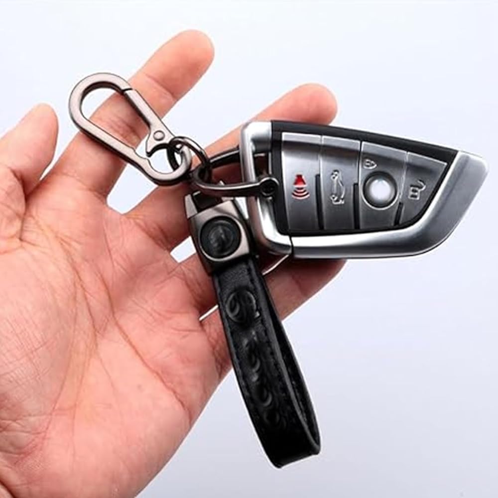 • The iron part of the keychain is zincized and looks shiny, the black leather keychain matches your car key and can be rotated 360 degrees
