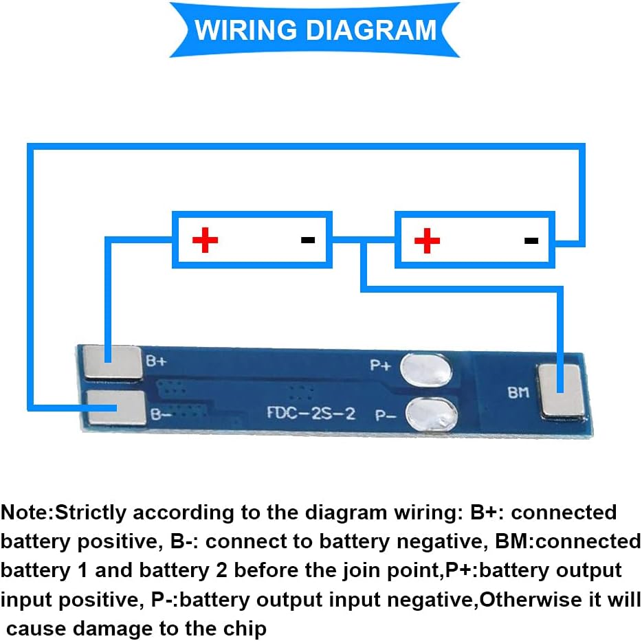 Note:Strictly according to the diagram wiring: B+: connected battery positive, B-: connect to battery negative, BM:connected battery 1 and battery 2 before the join point, P+:battery output input positive, P-:battery output input negative, Otherwise it will cause damage to the chip