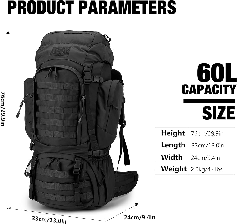 【DESIGN】- One front pocket(24*33cm/9.45*13in) and Two side pockets(14*27cm/5.5*10.6in) on the pack, it can hold snacks,flashlight,notebook,gloves,ropes,water bottle and other items. Other tactical pouches or camping gears also can be attached to the molle webbing with hooks.
