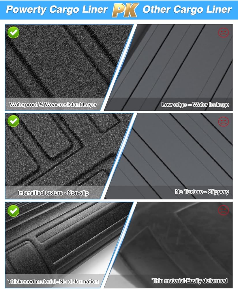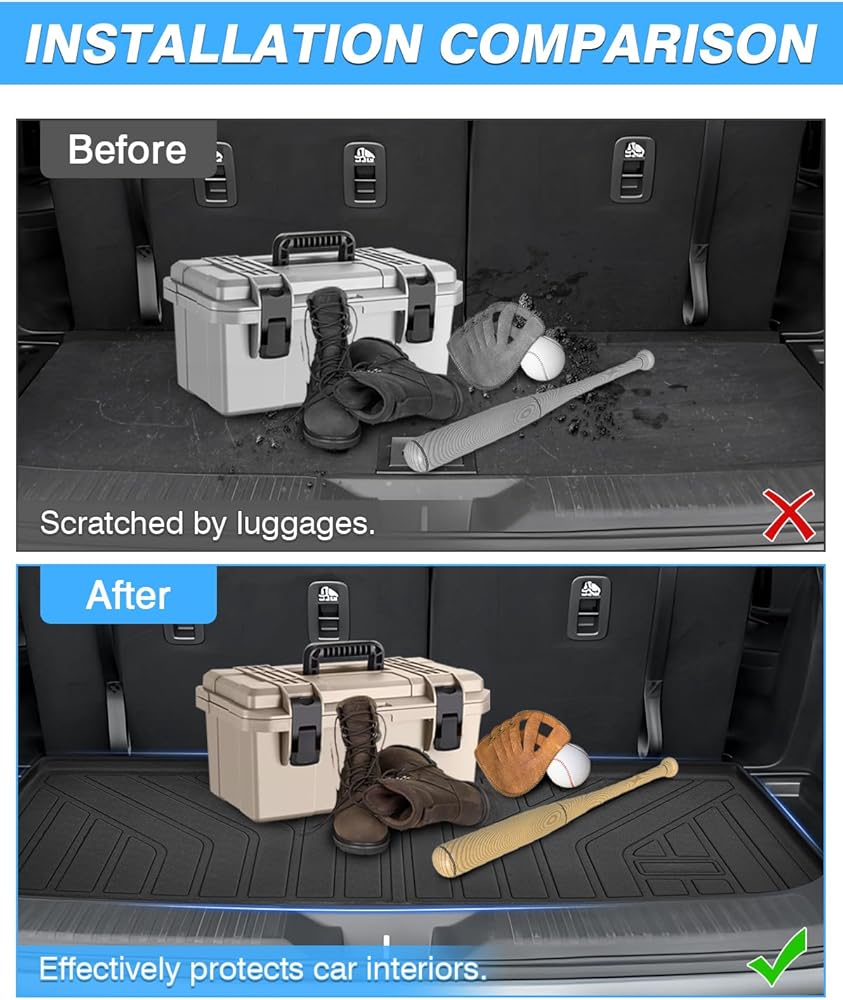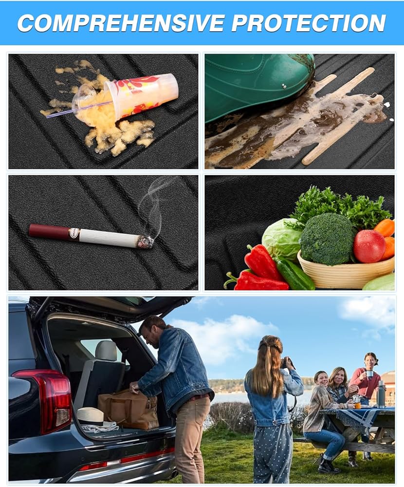 【Scratch Resistance】Strong flexibility of the trunk floor mat, easy to restore after folding,waterproof and resistant to dirt,Raised sides give extra protection, features grid pattern for a non-slip surface surrounded by a high ridge & edges. with the protection of the trunk cushion,you do not have to worry about the luggage will scratch or dirty car.