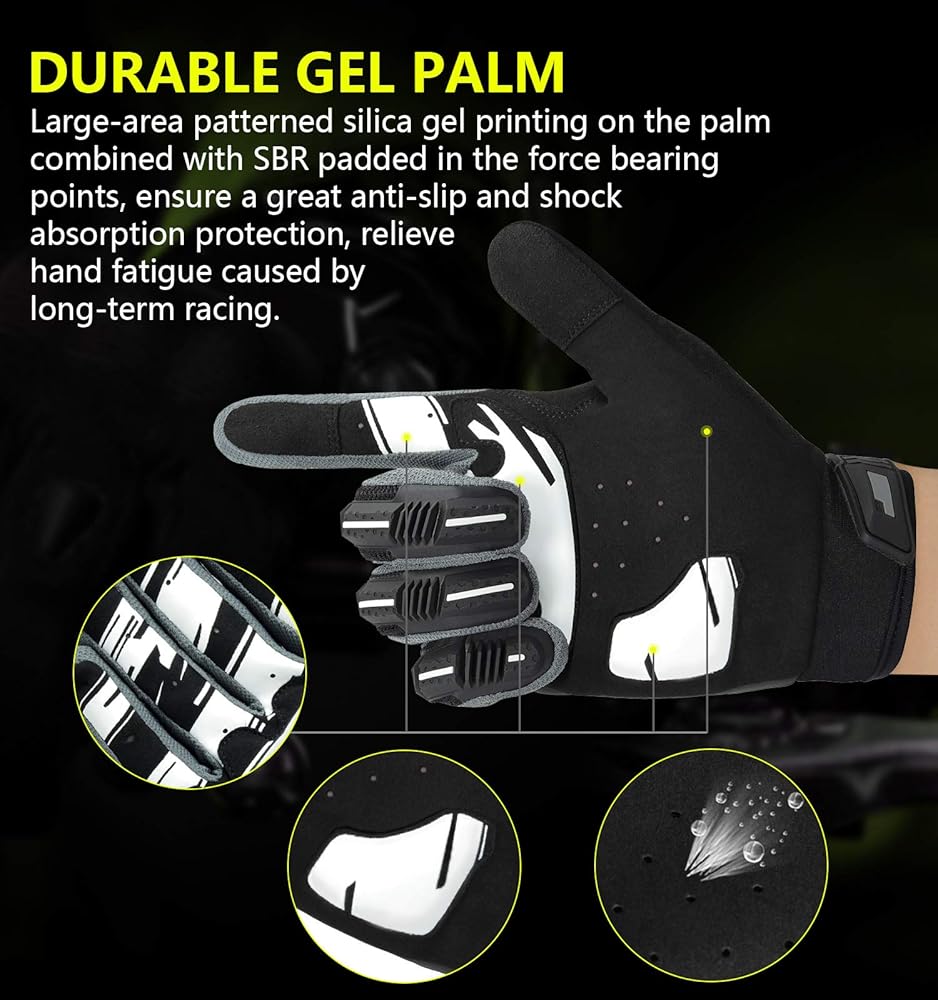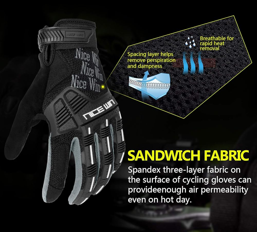 Durability: Large-area patterned silica gel printing on the palm of NICEWIN bike gloves combined with SBR padded in the force bearing points, ensure a great anti-slip and shock absorption protection, relieve hand fatigue caused by long-term racing, and avoid stuffiness of palm even in vigorous exercise. Unique patterns on fingers have the riding no longer monotonous