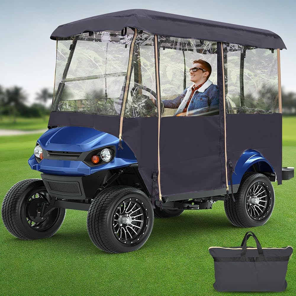 Design for All Weathers: Portable drivable golf cart cover enclosures offering protection against rain, wind, and sun. The 4-sided transparent windows allow clear visibility. When the weather is cold in winter, can keep people in the cart warm, making it an essential accessory for golf cart
