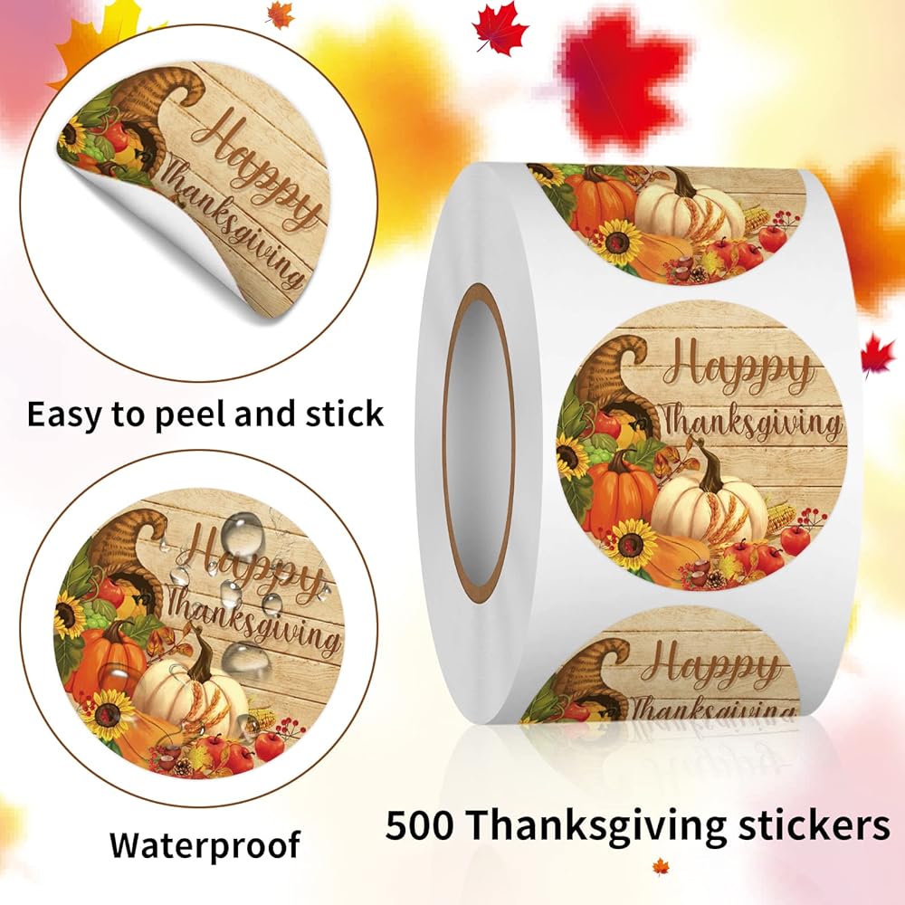 【Quantity & Size】The package contains 1 roll of Thanksgiving stickers (500 stickers in total), each sticker is 1.5in/3.8cm in diameter. Sufficient quantity and suitable size to meet your various party decoration and daily use needs.