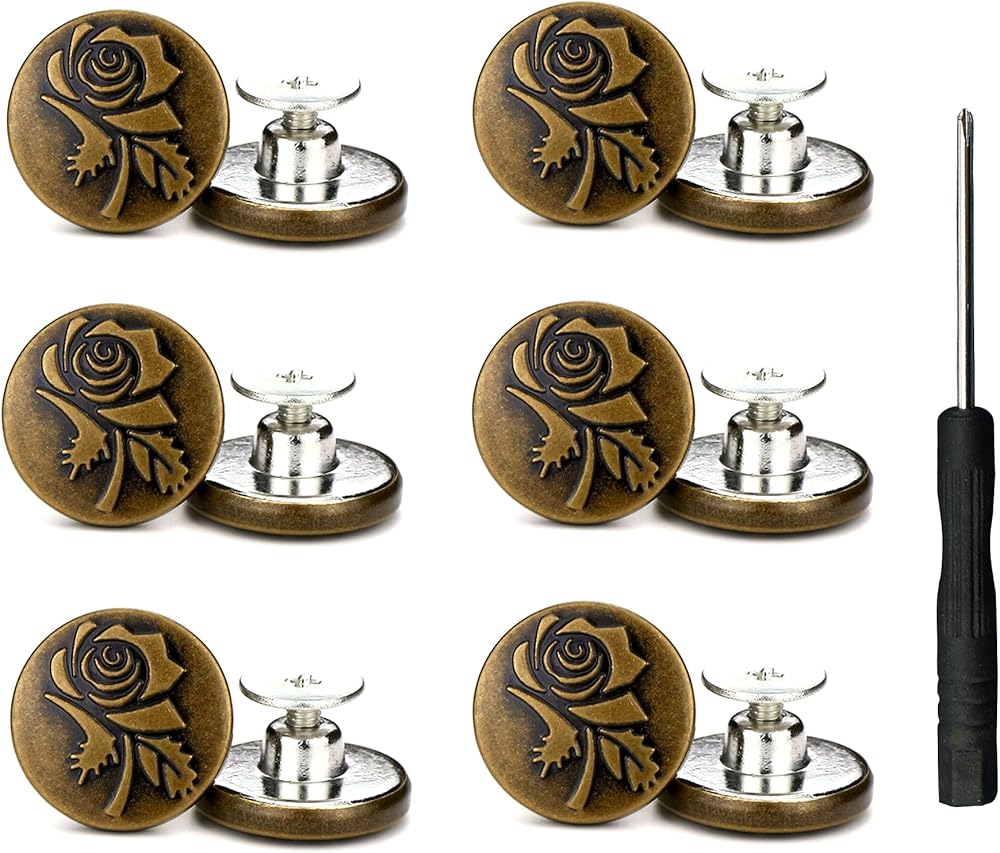 【Upgraded Buttons】17mm upgraded replacement jeans button surface monogram or other fashion patterns, can be matched with various styles of pants. Package includes: 12 x button caps, 12 x threaded rivets, 1 x screwdriver.