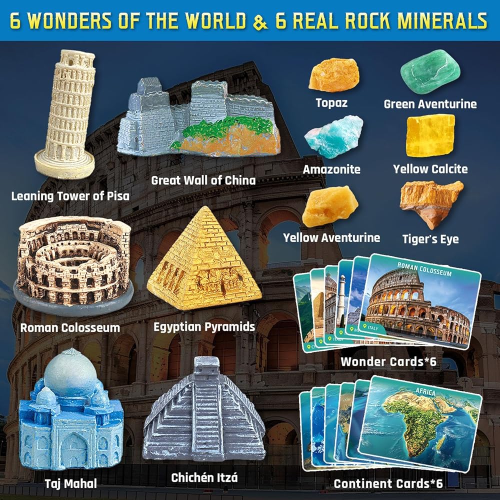💎「UNCOVER 12 HIDDEN TREASURES」To be a real geologist! As children dig into the model, they'll discover 6 earth's greatest landmarks hidden within. Moreover, you will dig up 6 extra natural gemstones including Topaz, Amazonite, Tiger's Eye, Yellow Calcite, Yellow Aventurine and Green Aventurine. Once you find out all the precious treasures, you can be back to the learning instruction book, which provides a fascinating introduction to these wonders, their names, and origins, helping kids learn about the unique landmarks that make up our world.