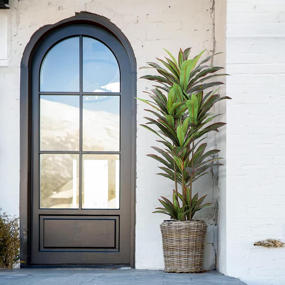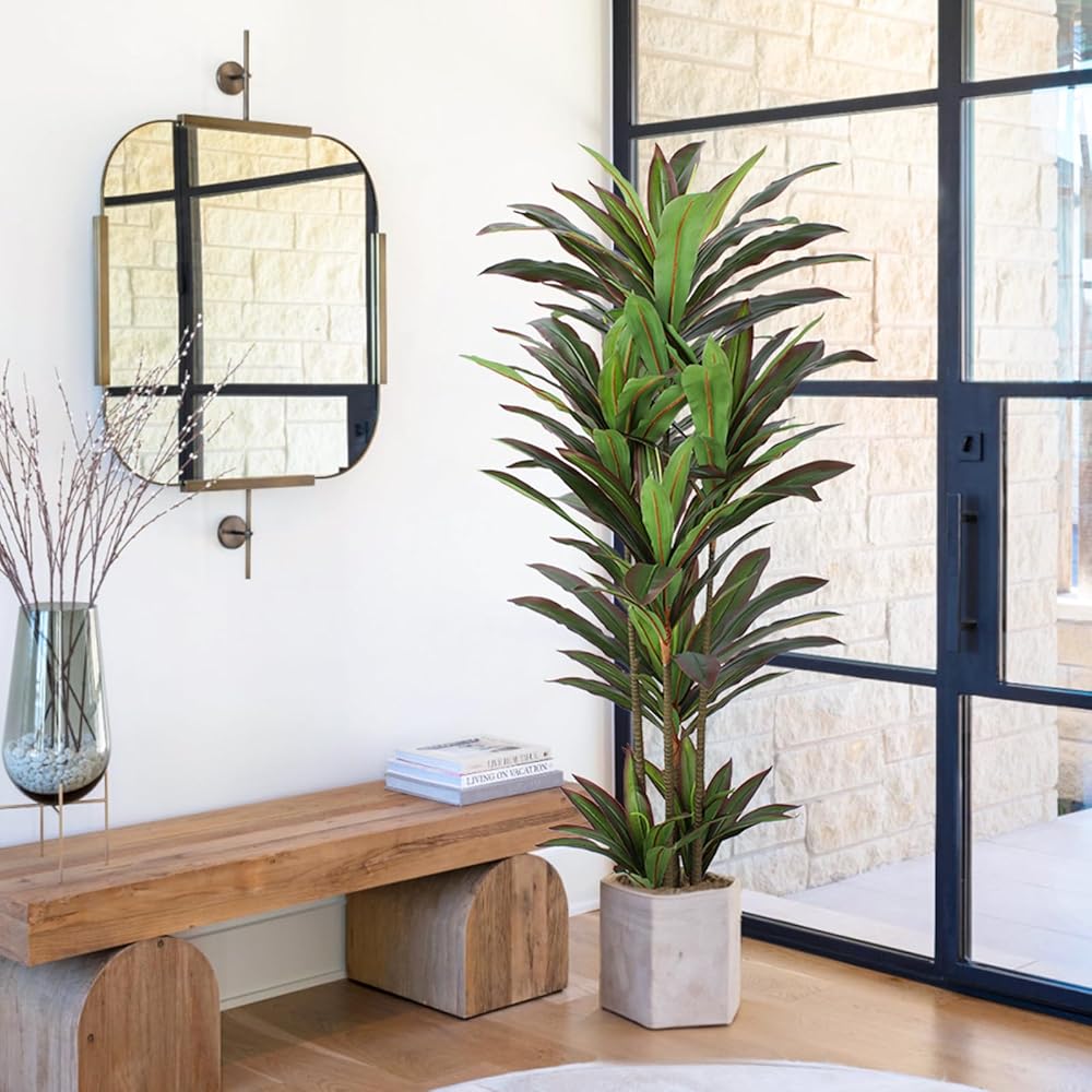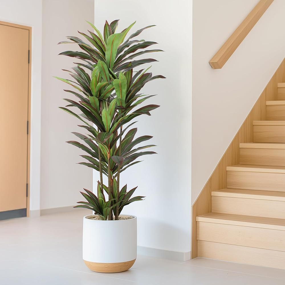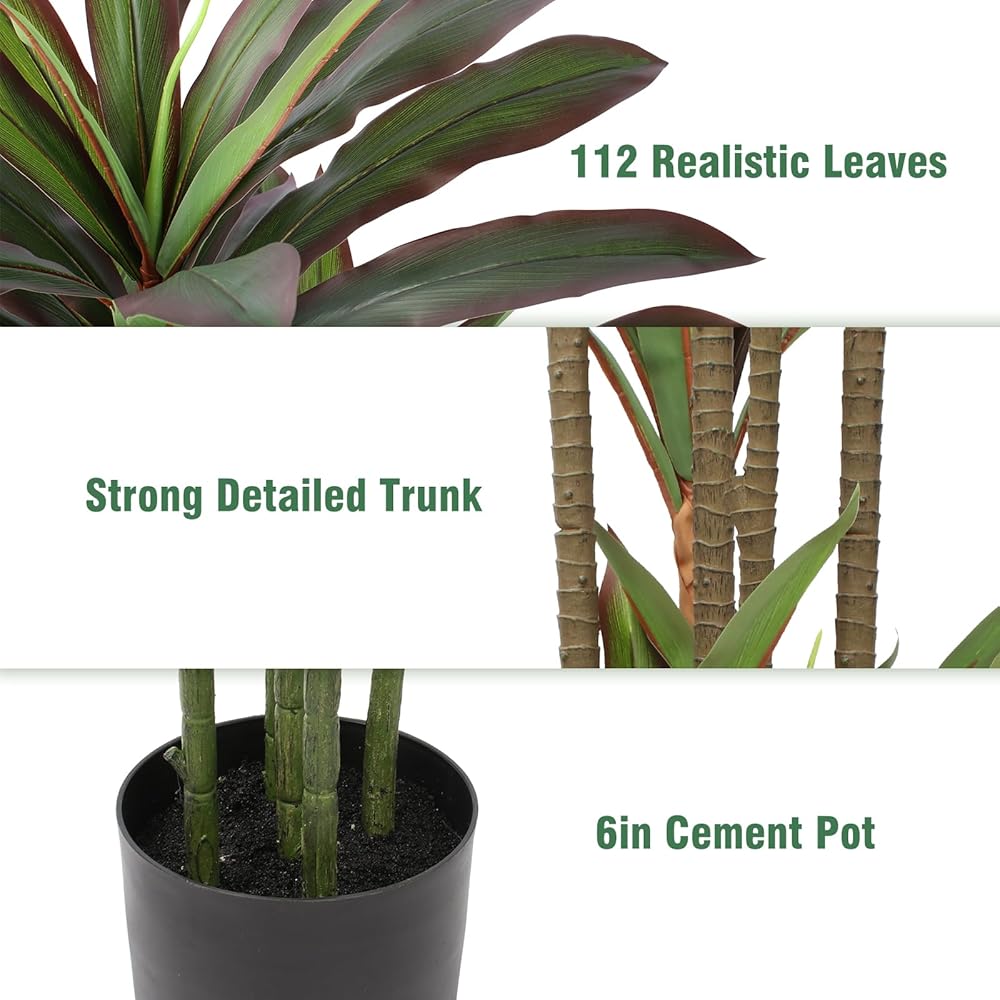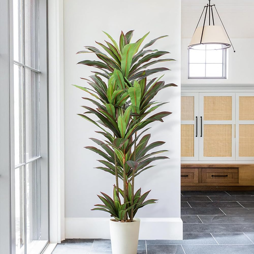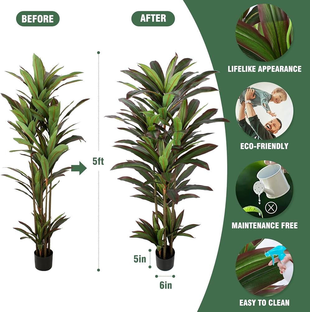 【Lifelike Appearance】Carefully crafted to mimic the appearance of a real live dracaena silk plant tree,looking as close to reality as possible, perfect for any room or office decor. 5 strong trunks adorned with 169 slender leaves with variegated red margins, clearly textured and vivid color makes this faux dracaena tree a timeless home decor for all seasons and will definitely make you feel the existence of nature.