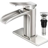 Bathroom Faucet Brushed Nickel OWOFAN Waterfall Washbasin Faucet with Pop Up Drain Single Handle Vanity Farmhouse RV Vessel Basin Mixer Tap Suitable for 1 or 3 Holes Supply Deck Plate and Hose