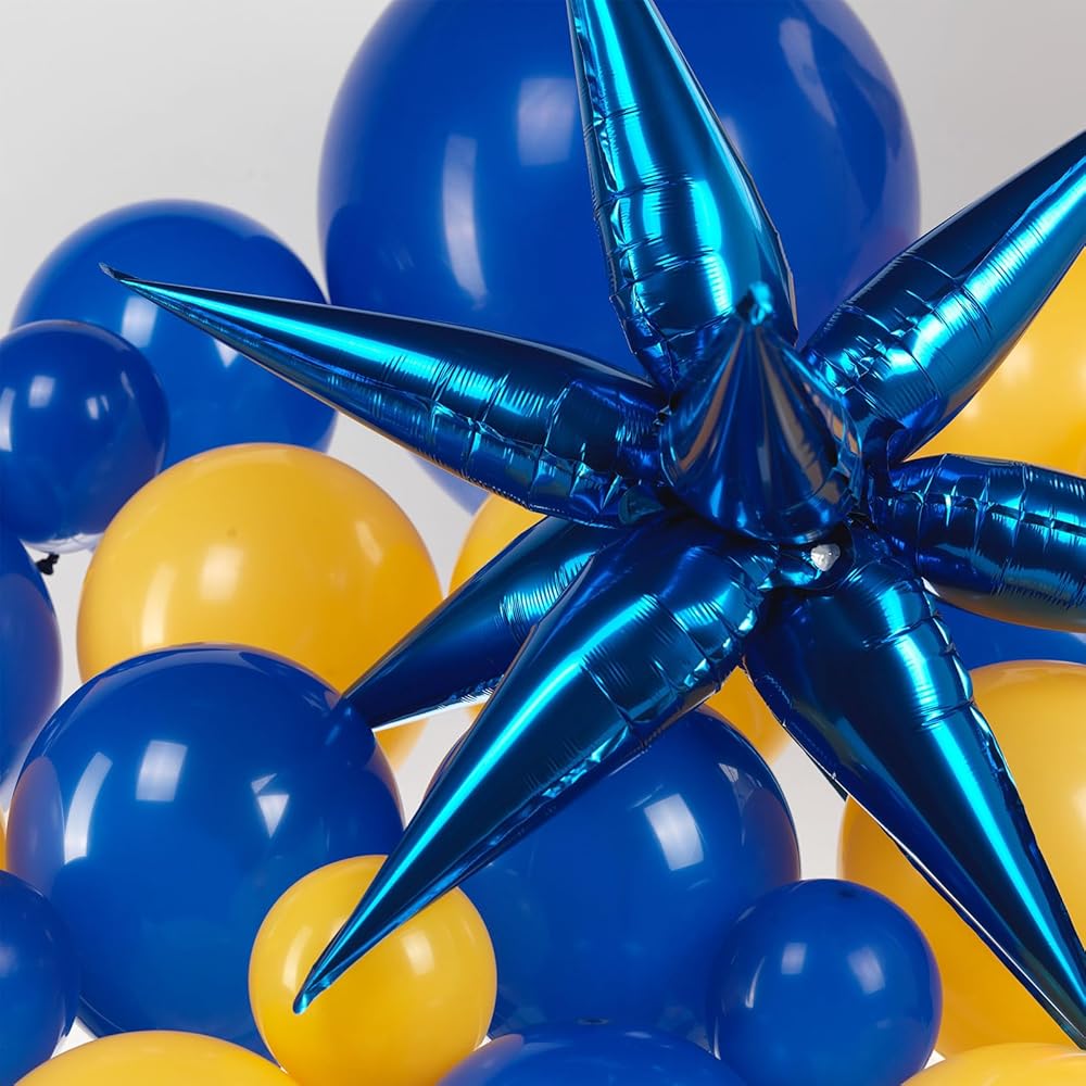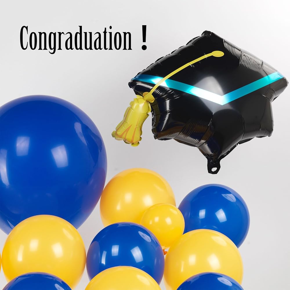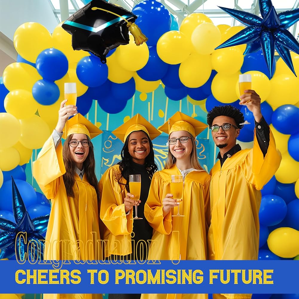 【Elegant Graduation Decorations 】111 pieces in one! Celebrate the Class of 2024 with royal blue, black, pearl white and gold balloons. Includes graduation cap and "GRAD" letter balloons and starburst balloons to create a stunning backdrop and classic 2024 prom decorations for your graduation party