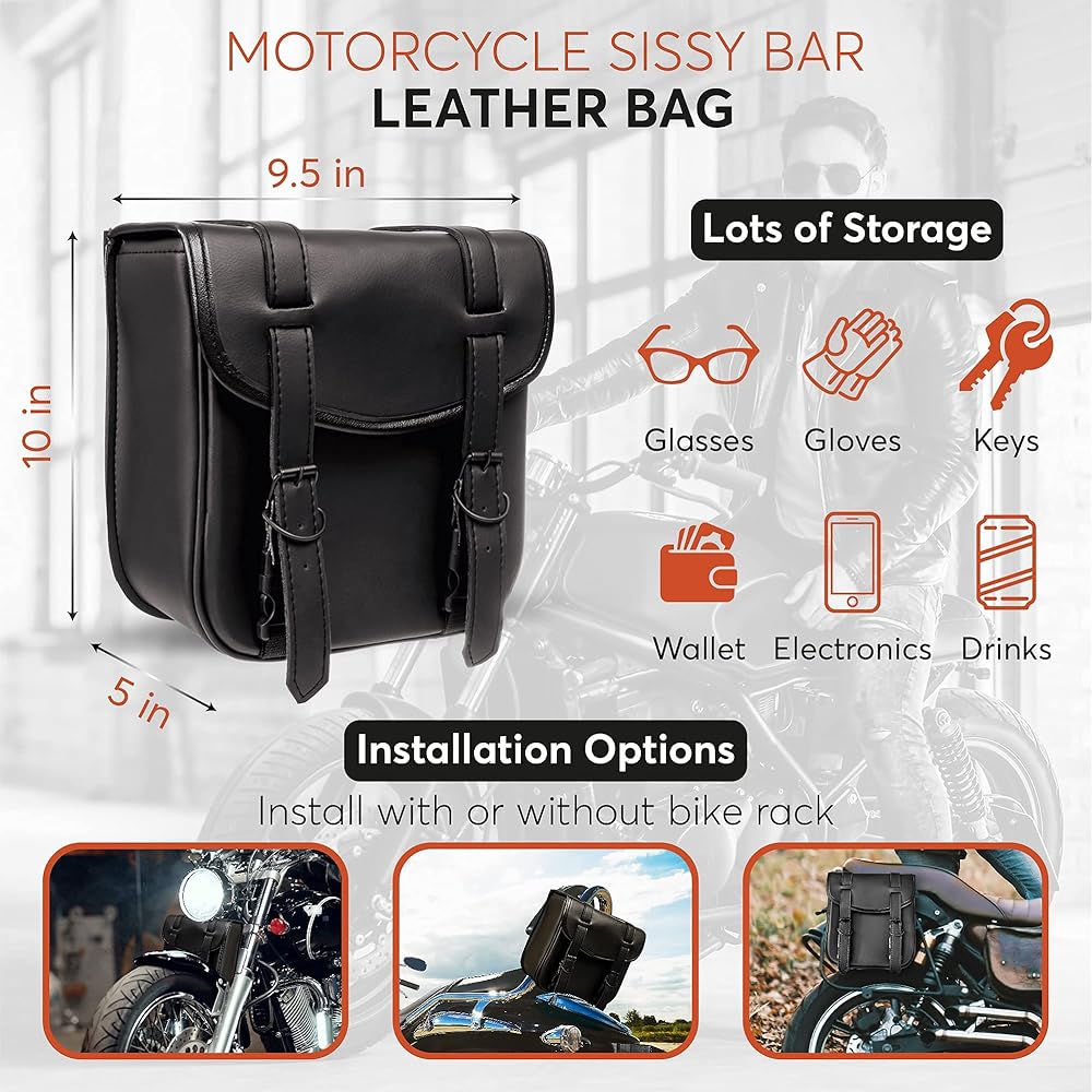 Quality- Made from premium PVC leather. Durable construction allows for many years of use. This motorcycle bag is made of quality leather, reinforced sewing and heavy duty materials so it can contain the shape.