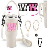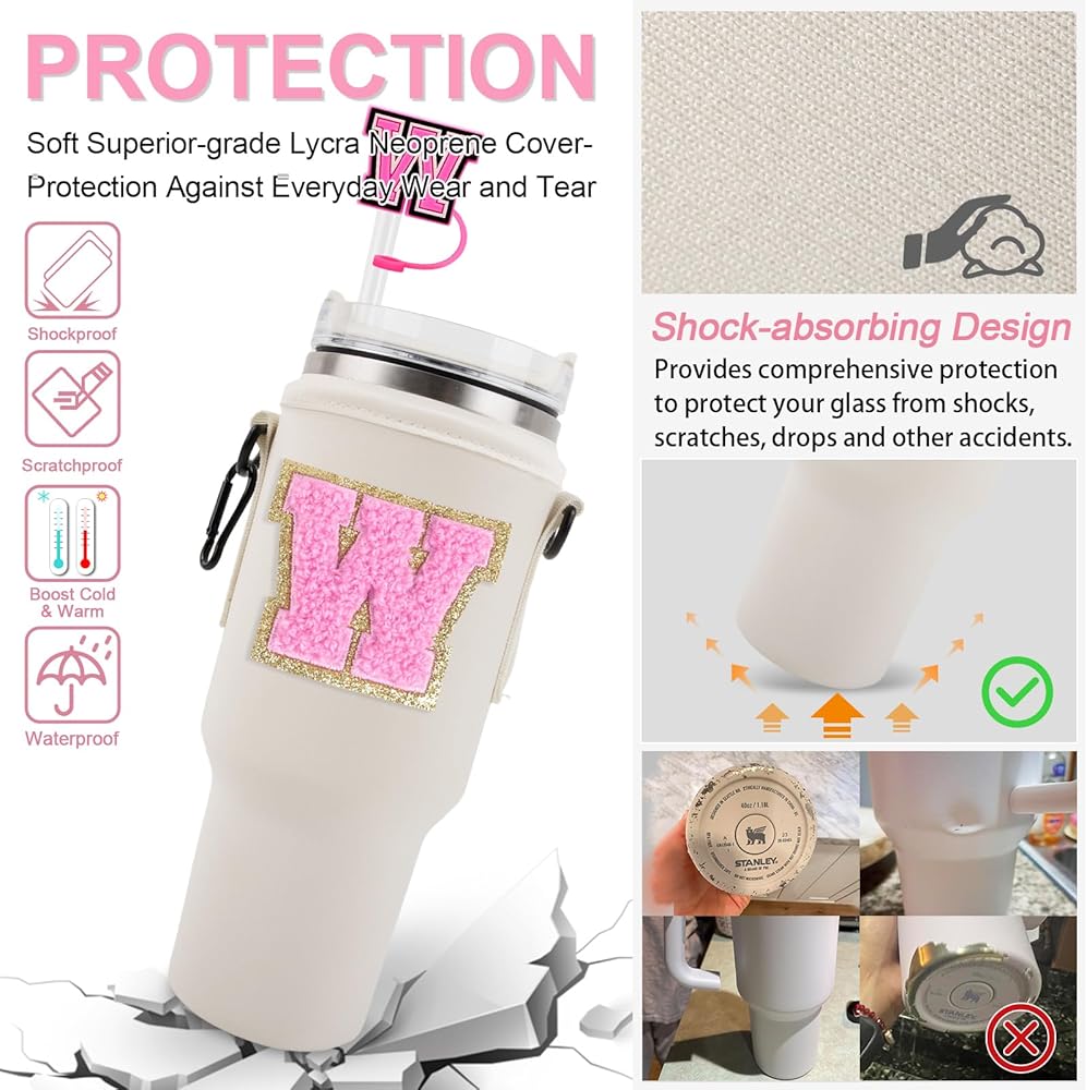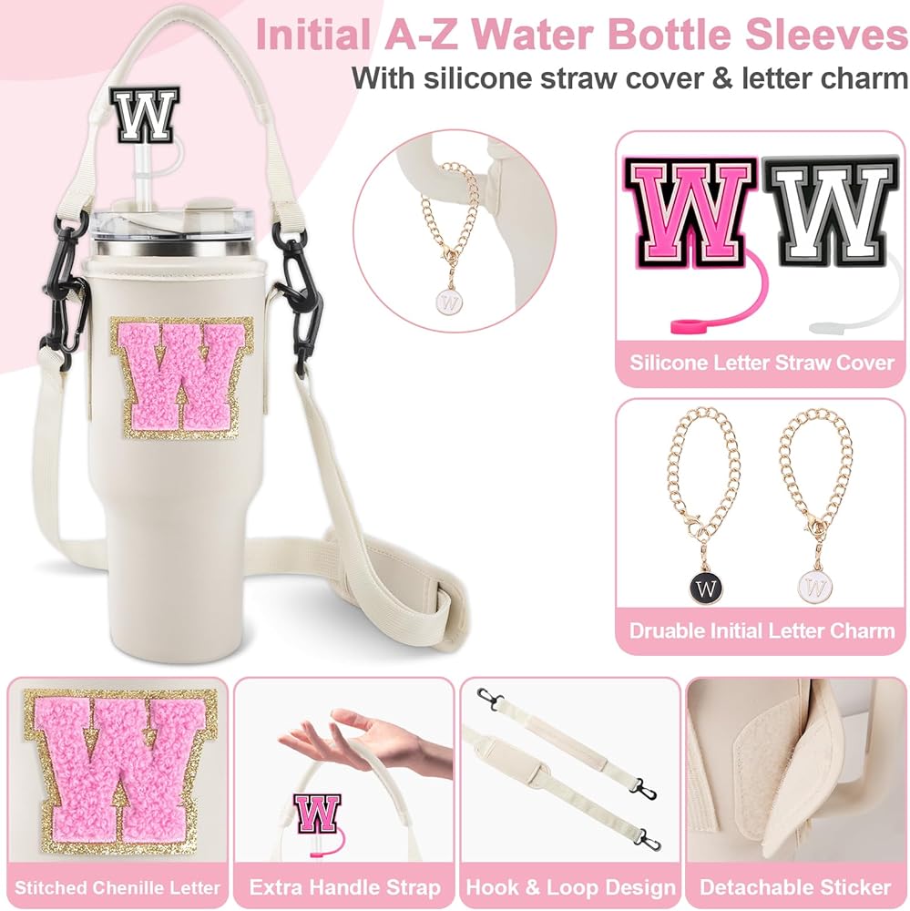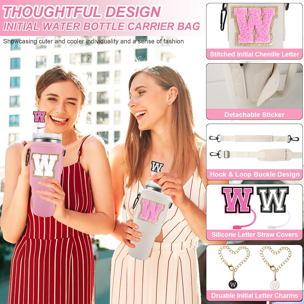 Initial A-Z Water Bottle Carrier Bag with Strap for Stanley 40oz Tumbler with 2 Letter Stanley Straw Topper Covers & 2 Letter Charms,Personalized Water Bottle Holder Sleeve for Stanley Cup Accessories