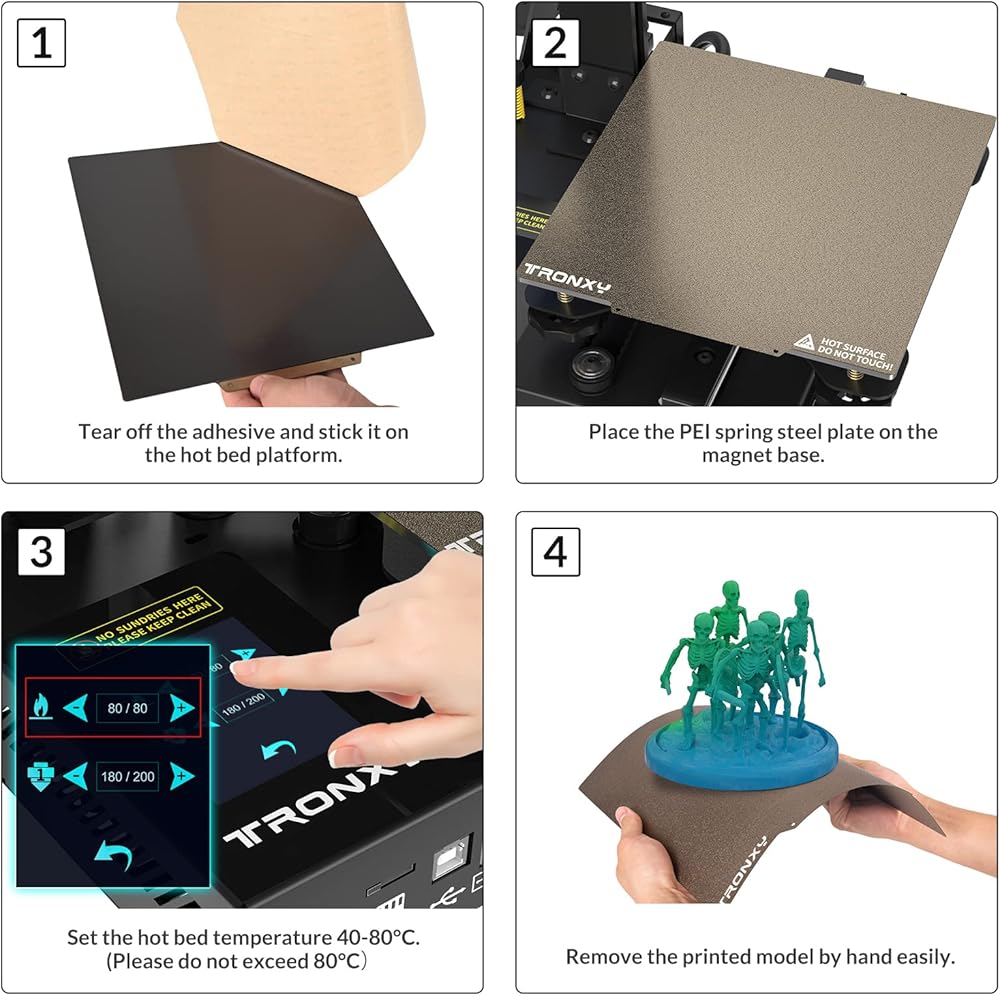 Easily Remove: After hot bed temperature cools down, easy get the 3D model, slightly bend to eject your prints instantly, no tools required, no need to worry about model damage