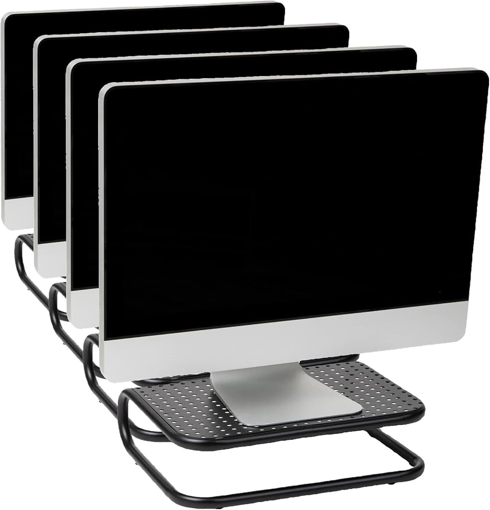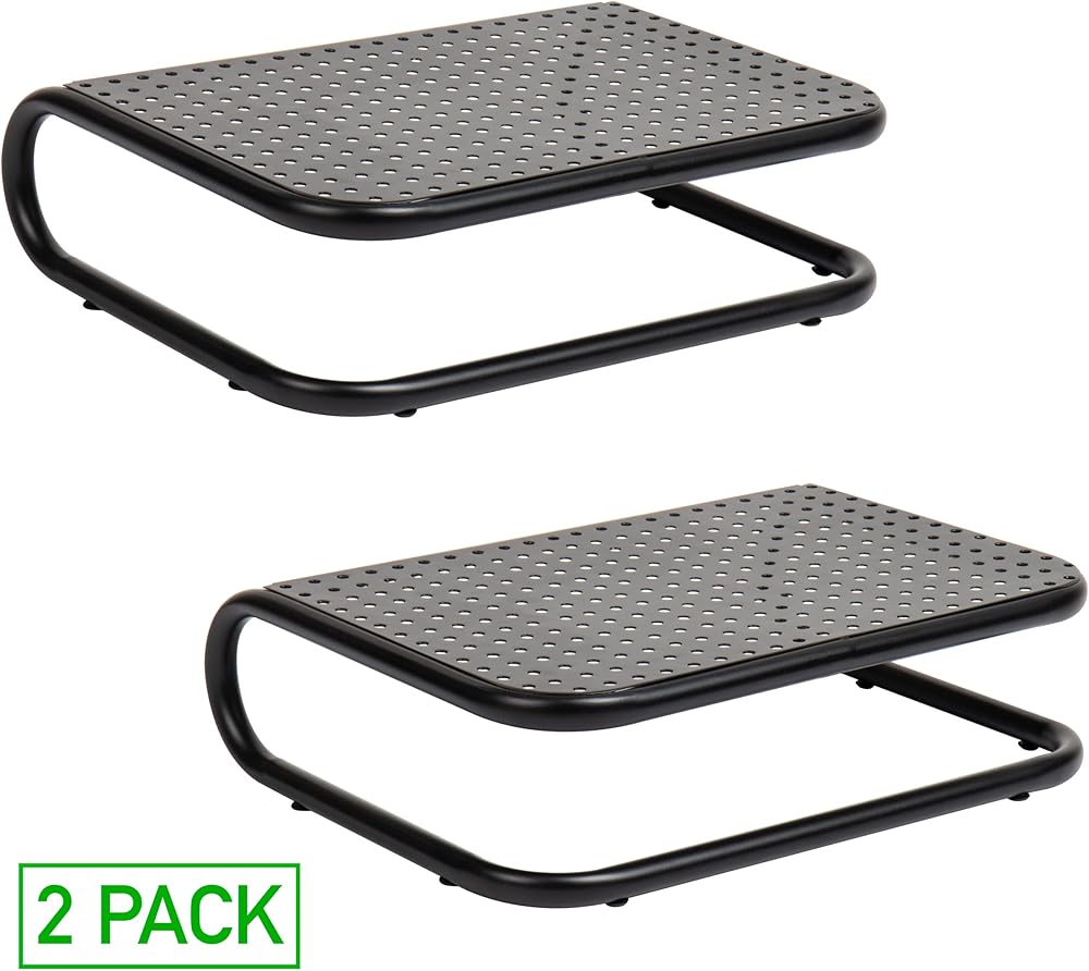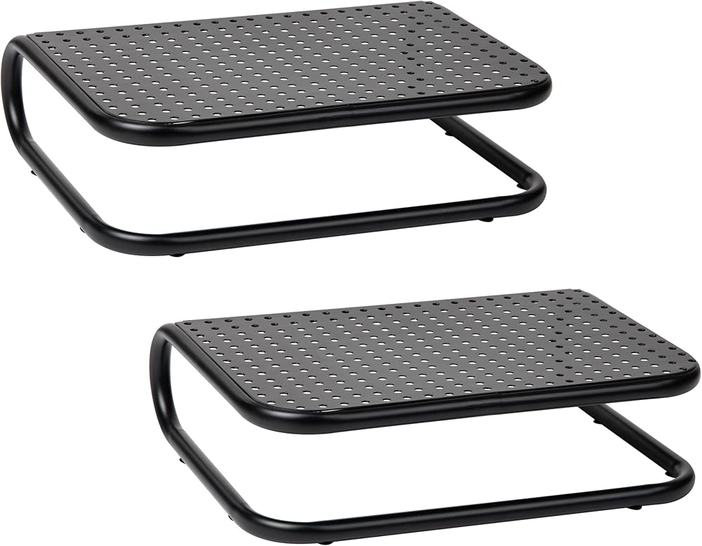 Elevate your workspace and improve your posture with this set of two black metal monitor stands. These stands can support up to 40 lbs of weight, making them ideal for dual-screen workstations, gaming desktops, or large monitors. The open-grid design allows for proper ventilation, preventing your devices from overheating.