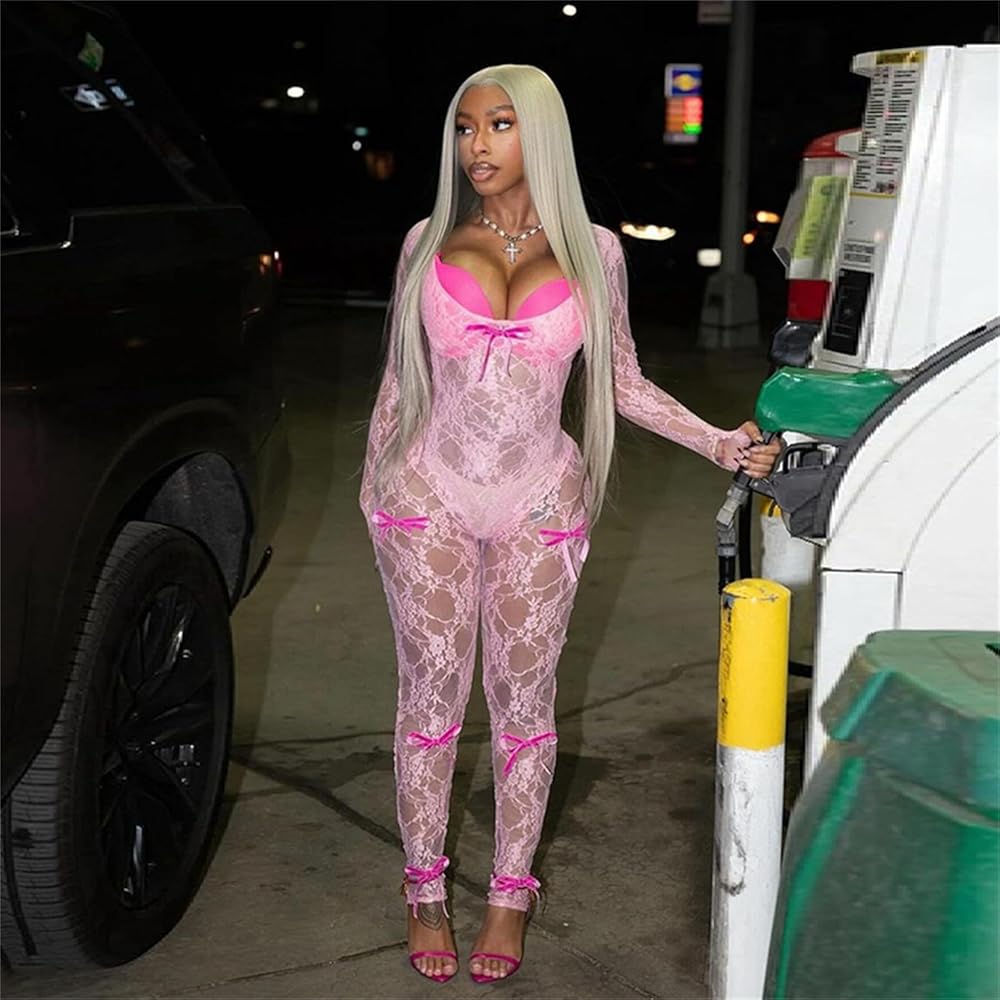 Style:This See Through Jumpsuit Makes You Shiny And Chic, High-Waisted Tight Lace Design Shows Sexy Curves And Makes You Extra Elegant, The Bow Embellishment Makes You More Playful And Cute;There Are 3 Colors To Choose From:Black Jumpsuit/Pink Jumpsuit/Blue Jumpsuits!