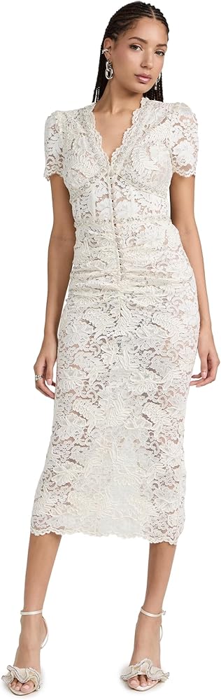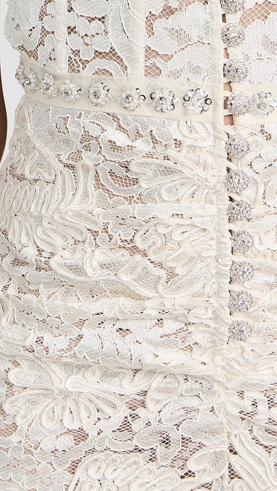 Runs true to size. Those between sizes may want to size up; dress offers little give. , Designed with a formfitting silhouette and midi length. Lace fabric is embellished with delicate beads, imitation pearls, and sequins; please handle with care.
