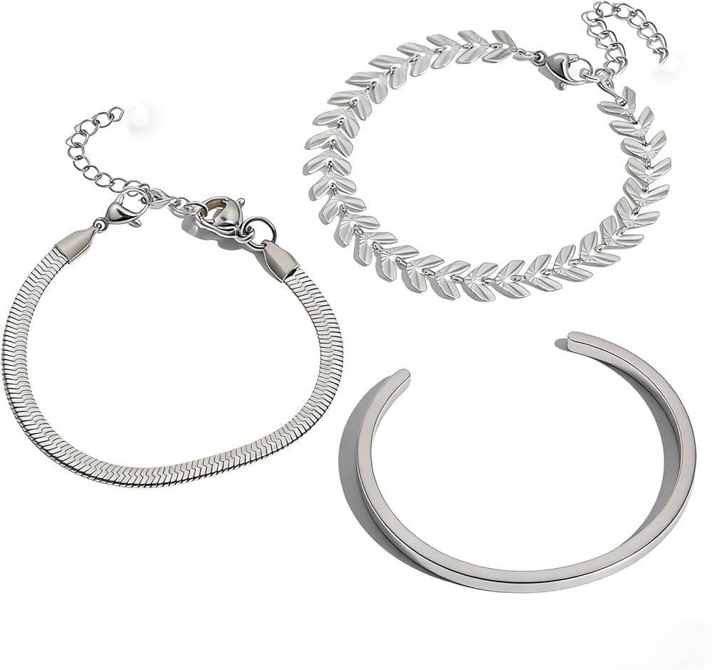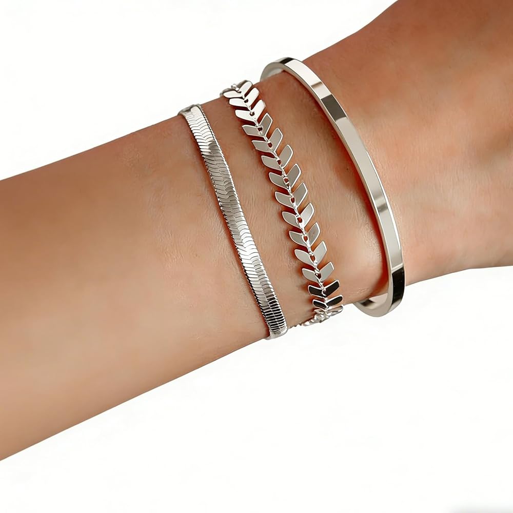 Fashionable Exquisite Bracelets--Our bracelet set can be stacked and worn, and we have designed several different styles of bracelets to enrich their fashion elements and enhance your charm. You can see flat snake bone bracelets, smooth faced bracelets, and herringbone patterned bracelets among them. The fashionable and rich appearance makes you always charming.