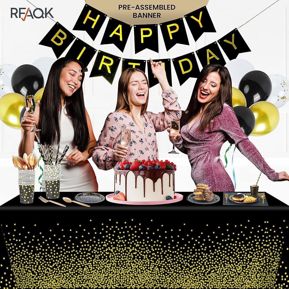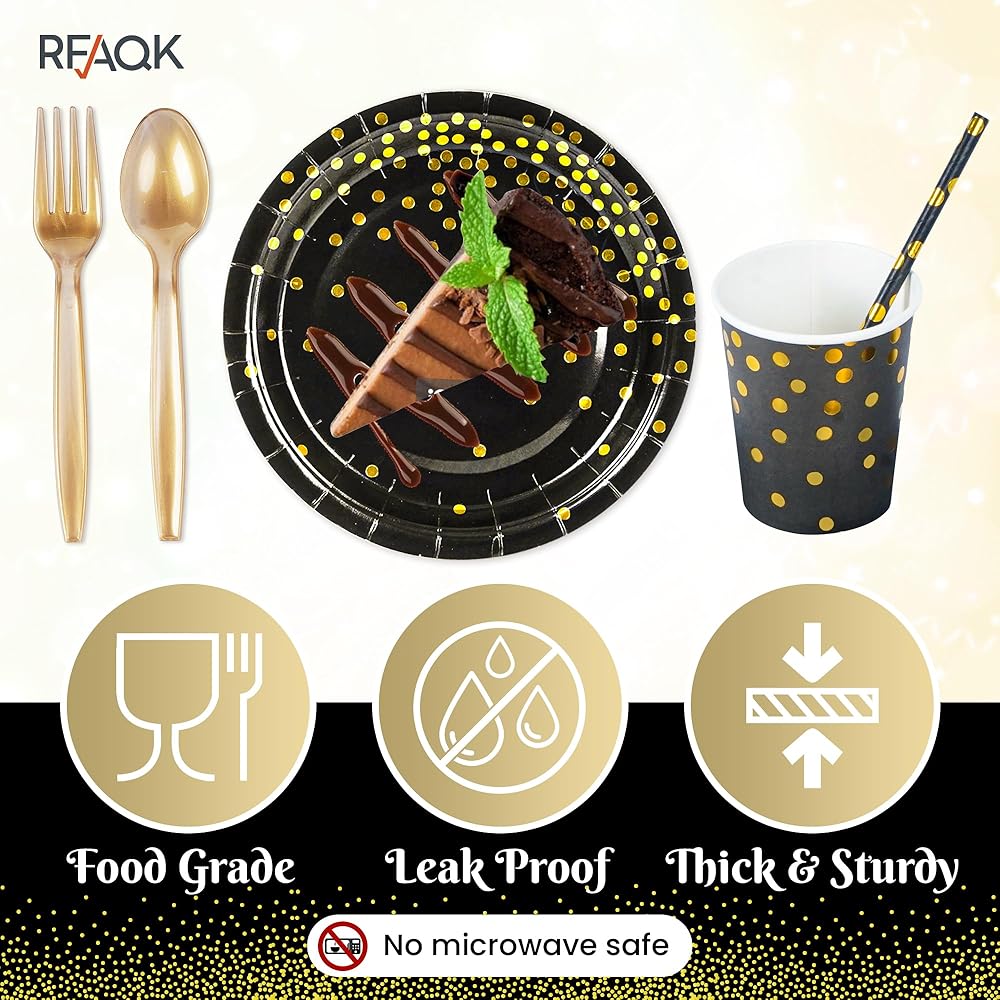 200PCS Black and Gold Party Supplies, Disposable Party Dinnerware Gold Plastic Spoons and Golden Dot Black Paper Plates Napkins Cups Banner for Birthday, Graduation and Wedding Party, Severs 24 Guests