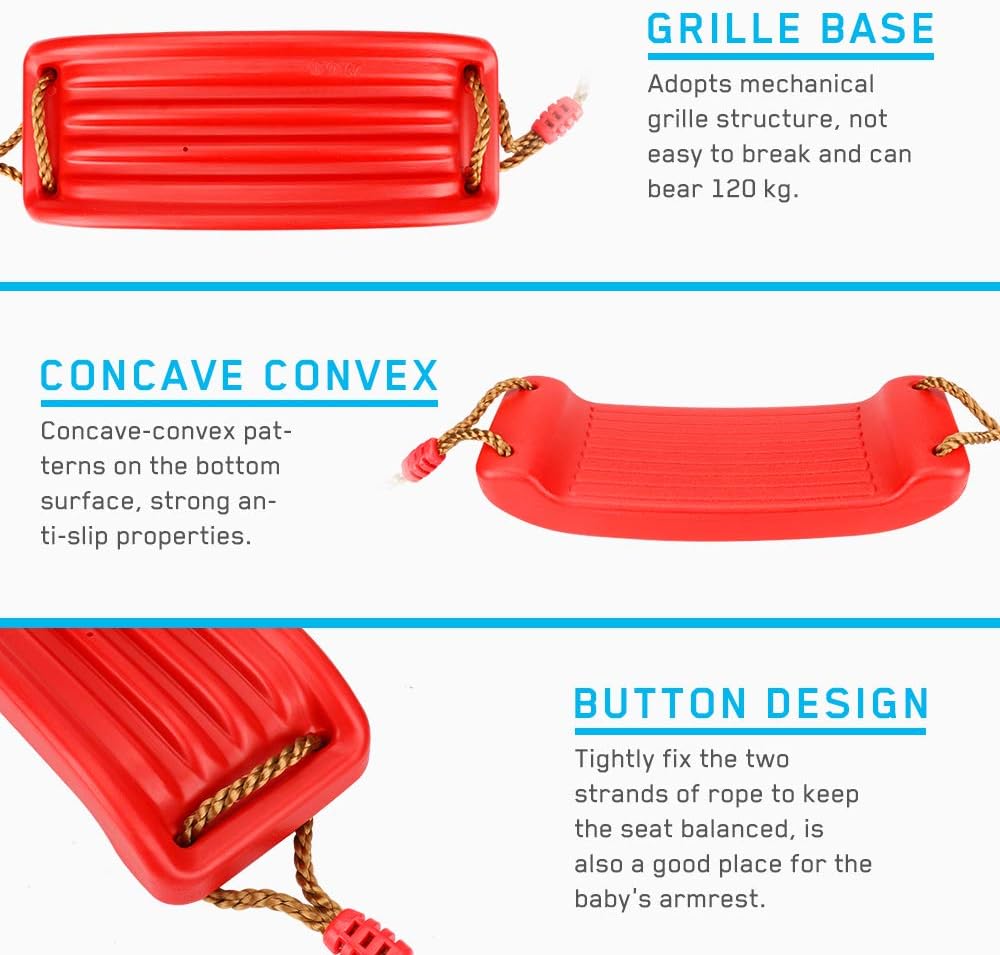 【Strong Bearing & Adjustable】Children swing adopts grille base structure with button design, firm and keep the seat balanced, not easy to break, the button is also a good place for the baby's armrest, can bear 440lb(200 kg). The concave-convex patterns on the bottom surface, with strong anti-slip properties. The adjustable rope with 8-shaped circle design, the length (45.28-72.83 in/115 -185 cm) can be adjusted to suit your own length.