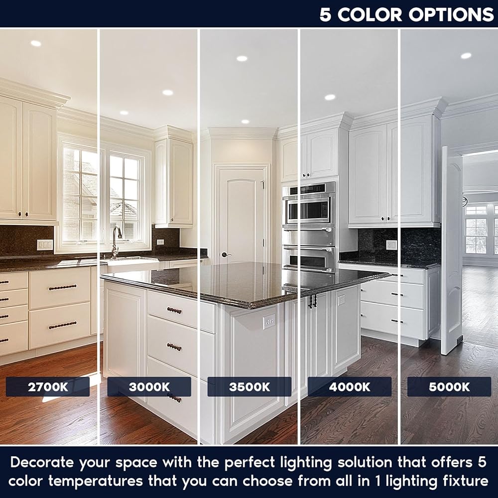 5 COLOR OPTIONS - Say goodbye to the limitations of choosing just one color, as these recessed ceiling lights offer the flexibility to switch between 5 different color temperatures. Each 5 cct color changing light fixture features an on-board adjustable switch, allowing you to transition between 2700K warm white, 3000K soft white, 3500K natural white, 4000K cool white, or 5000K bright white. Experience real-time lighting options with quality CRI 90 light.