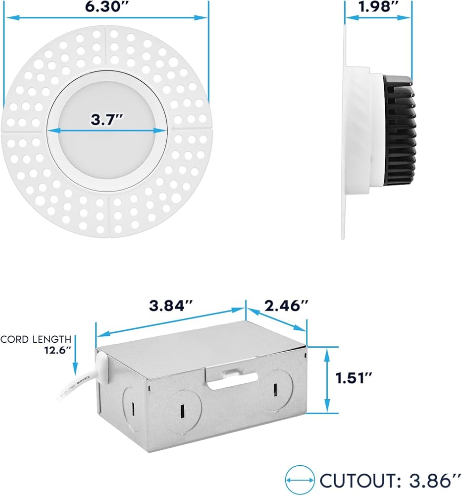 TRIMLESS DECOR - Enjoy a ceiling light that will enhance your space with a minimalist charm distinct from traditional recessed lighting. These 4 inch LED recessed lights provide a trimless design that seamlessly merge with your ceiling for a modern lighting experience. Easily refine your space by choosing your light location, plaster-in the trimless frame, connecting the fixture to your home wiring, and securely locking the LED lights in place with a twist. Cutout Size: 3.86"
