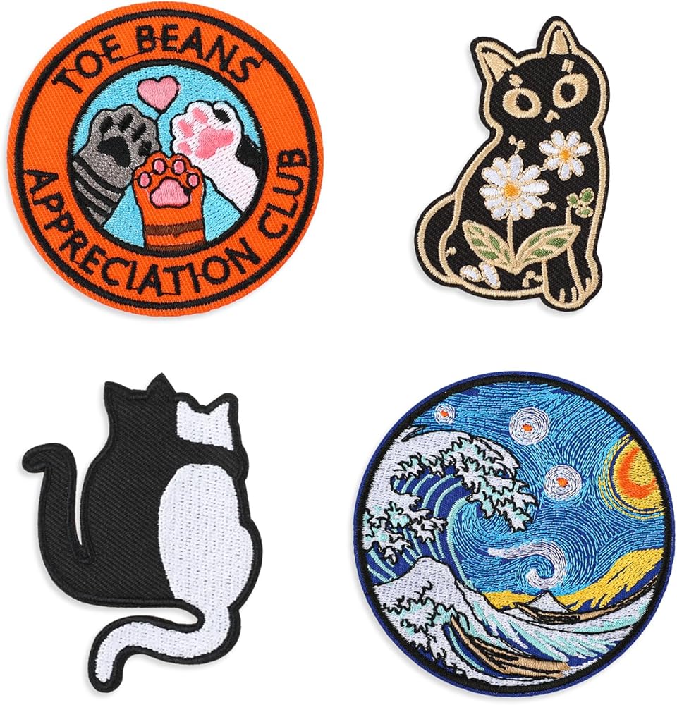 Embroidered Iron On Patches, 4 Pcs Great Wave Cats Patches Funny Cute Colorful Embroidered Appliques DIY Accessories for Backpacks Jackets Jeans Bags