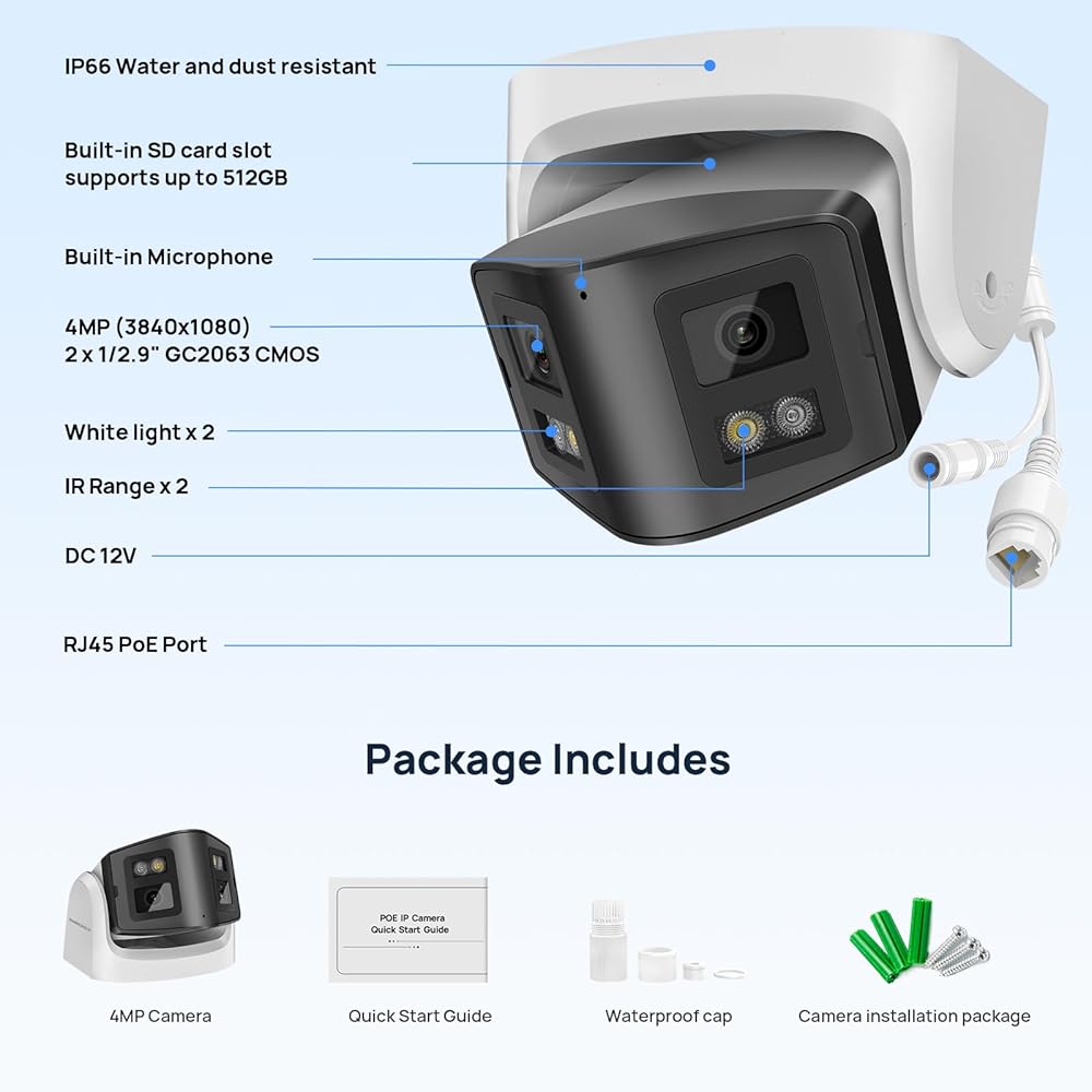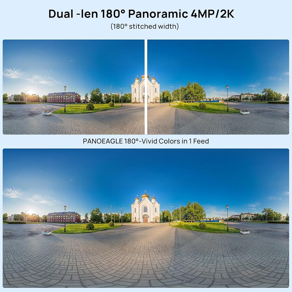 【180° PANORAMIC VIEW SECURITY CAMERA】 This 4mp dual-image security camera is equipped with built-in 2 × 1/2.9" progressive scan CMOS,2 × fixed focal 4mm lens and and F1.6 aperture,create 180° panoramic views with less distortion & fewer blind spots.120 DB WDR technology will achieving better image in all lighting conditions.