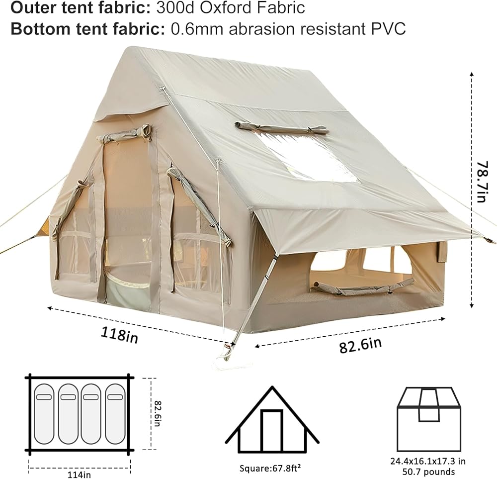 السلامة وسهولة الإعداد: تتميز الخيم القابلة للنفخ للتخييم بهيكل دعم ذاتي قابل للنفخ، لذلك ليست هناك حاجة لتركيب قضبان الدعم يدويًا. يمكن إعداده في أربع خطوات سهلة. افردي الخيمة، وثبتيها وانفخيها، ثم ثبتي أركانها الأربع. يمكن تركيب خيام التخييم الفورية بالكامل بنفسك خلال 5 دقائق. بفضل هيكل الدعم الأكبر وغرف الهواء، يمكن أن تظل الخيمة ثابتة وتحافظ على سلامتك.