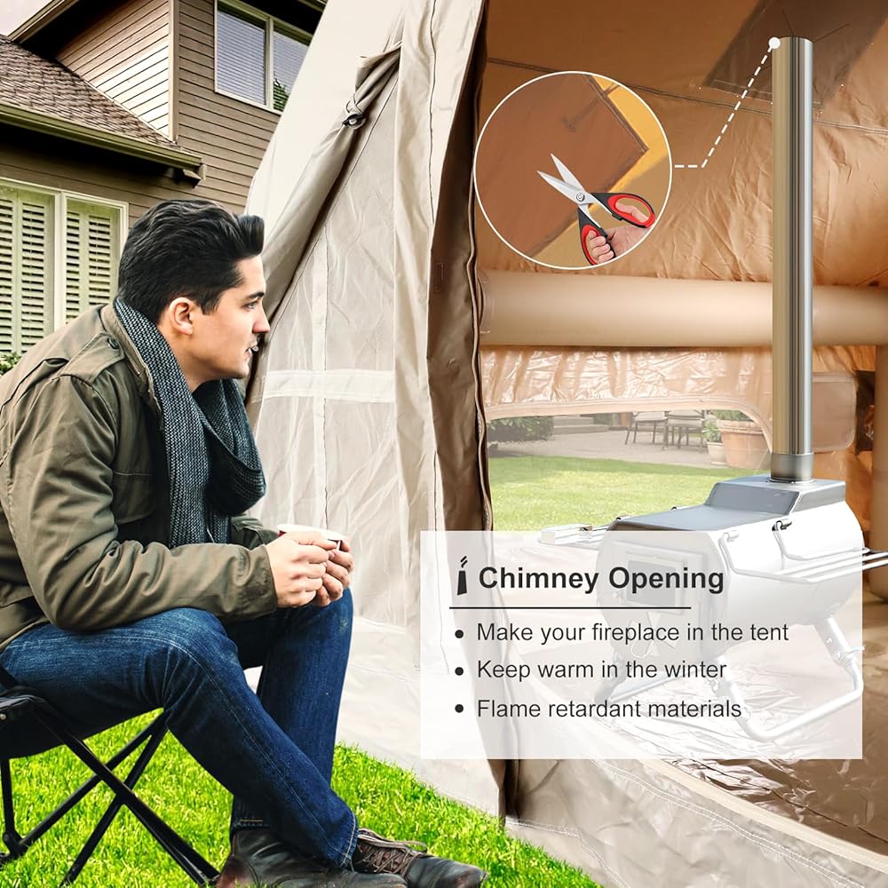 فتحة المدخنة: تحتوي خيمة EKEPE 4 Season على فتحة مدخنة تمكنك من عمل فتحة دخان مناسبة للمدفأة الخاصة بك. ما عليك سوى قطع الصليب ويمكنك الاستعداد للمدفأة الخاصة بك. عندما لا تكون المدفأة قيد الاستخدام، يمكن إغلاق فتحة المدخنة. مع هذا التصميم، يمكنك الاستمتاع بالوقت في الهواء الطلق حتى في الخريف والشتاء.