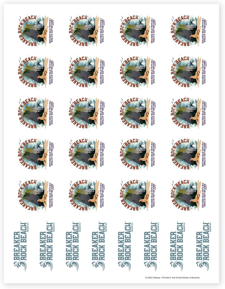 VBS 2024 Logo Stickers are perfect for handouts, gift bags, envelopes, and prizes. Package of 10 sheets filled with stickers. At Breaker Rock Beach VBS, kids will be challenged as they discover that God's truth never changes, everyone needs Jesus, and learn to speak the truth in love. Adventure awaits each day as kids explore tide pools, spot orcas, fly kites, and watch the mighty waves crash up against the immovable Breaker Rock!
