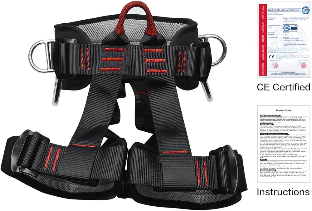 ※Safety—This safety gear is constructed from quick-dry nylon webbing. Professional high-tension sewing threads make it stronger and safer. 300 kg weight limit. Breaking strength: 25KN .CE Certified. Note: This is a larger climbing gear. It is not suitable for particularly thin individuals or small children. Note: The date on the label is the date of manufacture.
