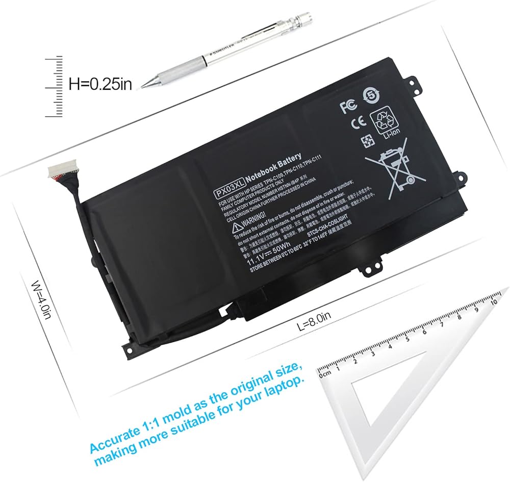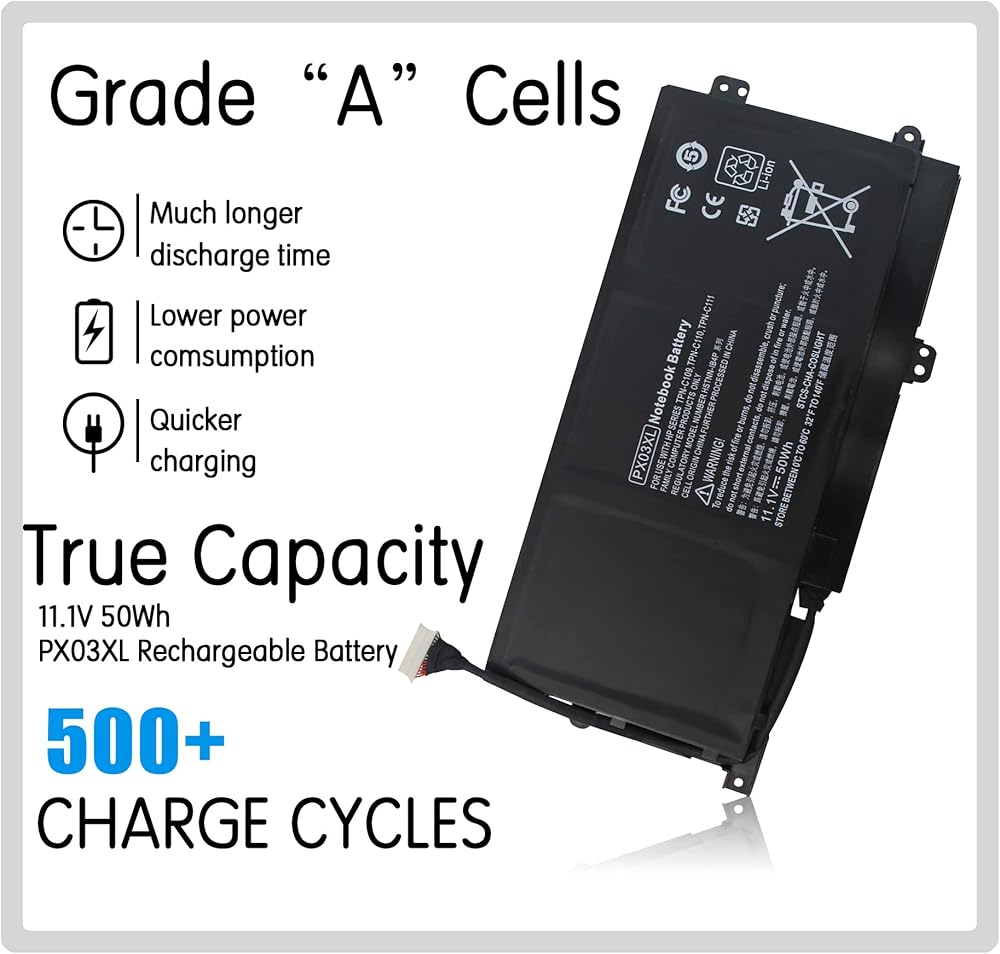 • POWER SPECS: Type: PX03XL, Capacity: 4500mAh / 50WH, Voltage: 11.1V / 11.25V / 11.4V, Battery type: Lithium-Ion, 100% brand new. Black with Two Free Screwdrivers. We have concentrated on the laptop batteries production for more than twenty years. Each of our PX03XL 715050-001 notebook battery for HP is CE-/FCC-/RoHS-Certified; K025DX K010DX K012DX K015DX K122DX K125DX K002TX K022DX .