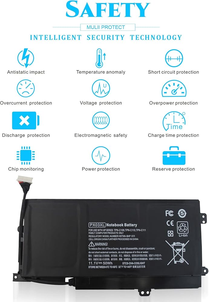 • TOP QUALITY MATERIAL THAT LASTS: Our PX03XL 715050-001 notebook battery for HP is an upgraded version. In order to increase the operating time, our batteries are assembled from top quality material and circuit boards to ensure fast charges and low power consumption. You can use it safely and buy it with confidence at any time .
