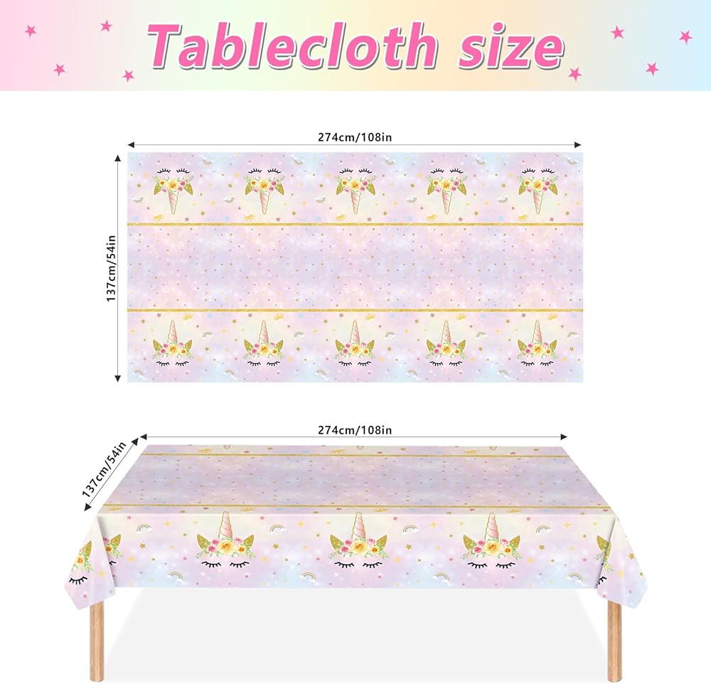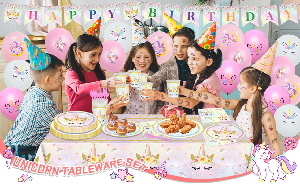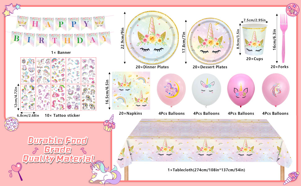 Unicorn Birthday Party Supplies Serve 20: This unicorn theme birthday party tableware set that serves 20 people has 128 pieces, including 20 x unicorn dinner plates (9 inch), 20 x unicorn dessert plates (7 inch), 20 x unicorn cups, 20 x unicorn napkins, 20 x forks, 1 x unicorn tablecloth (54"x108"), 1 x happy birthday banner, 16 x balloons and 10 sheets temporary tattoos. Meet all your unicorn theme birthday party decoration needs in one step.