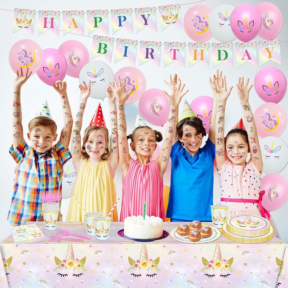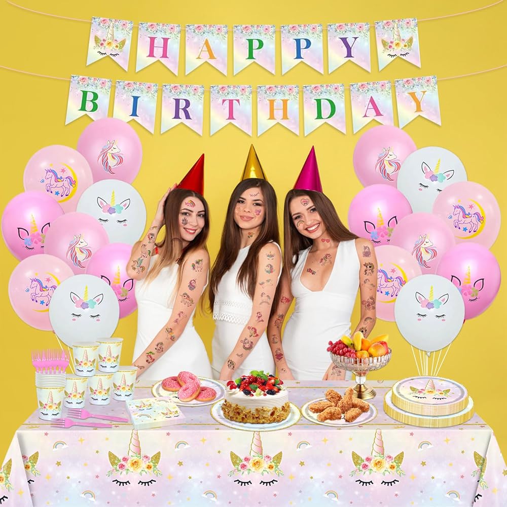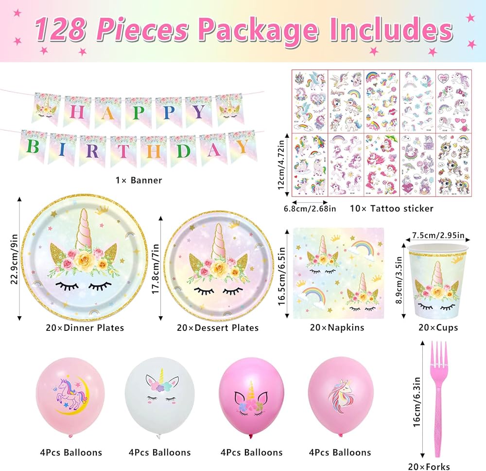 128PCS Unicorn Birthday Party Supplies Unicorn Birthday Decorations for Girls Unicorn Paper Plates and Napkins Tableware Balloons Temporary Tattoo Rainbow Unicorn Party Decorations Serve 20
