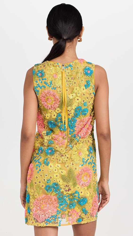 Runs slightly small; those between sizes may want to size up., Shift dress has a relaxed silhouette with a mini length. Long pull at back zip allows for self-closure. Sequined mesh has a delicate hand and features a floral pattern.