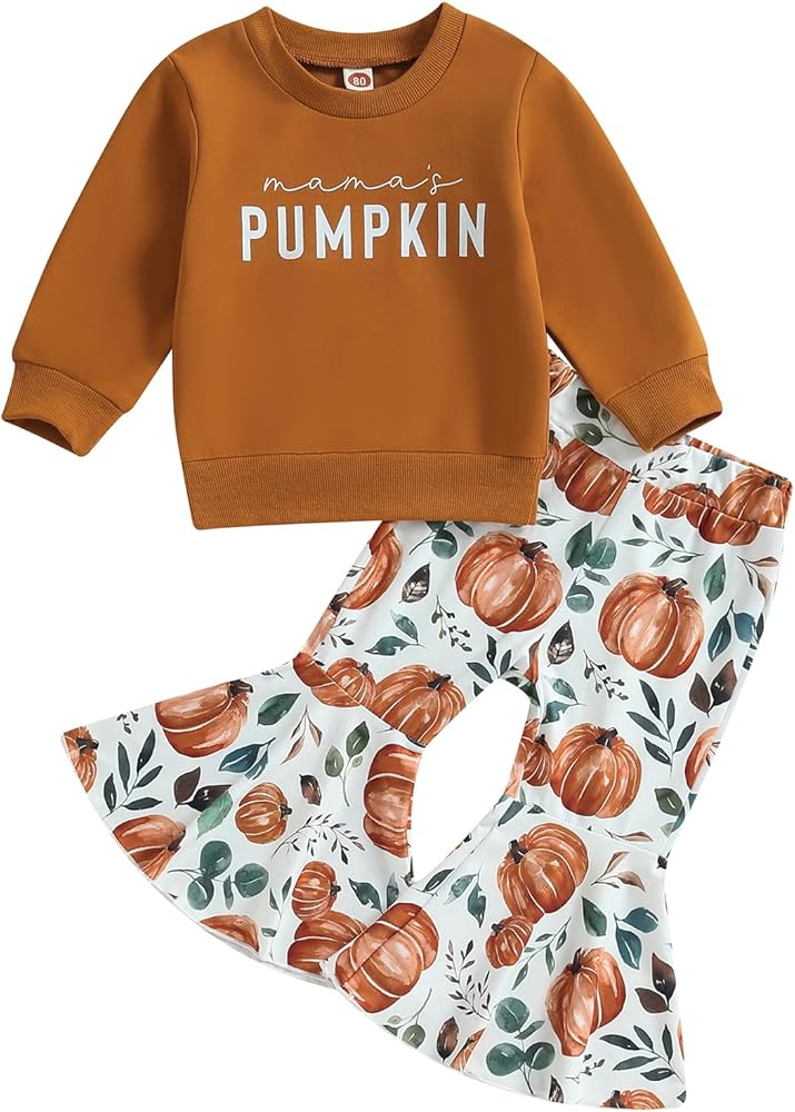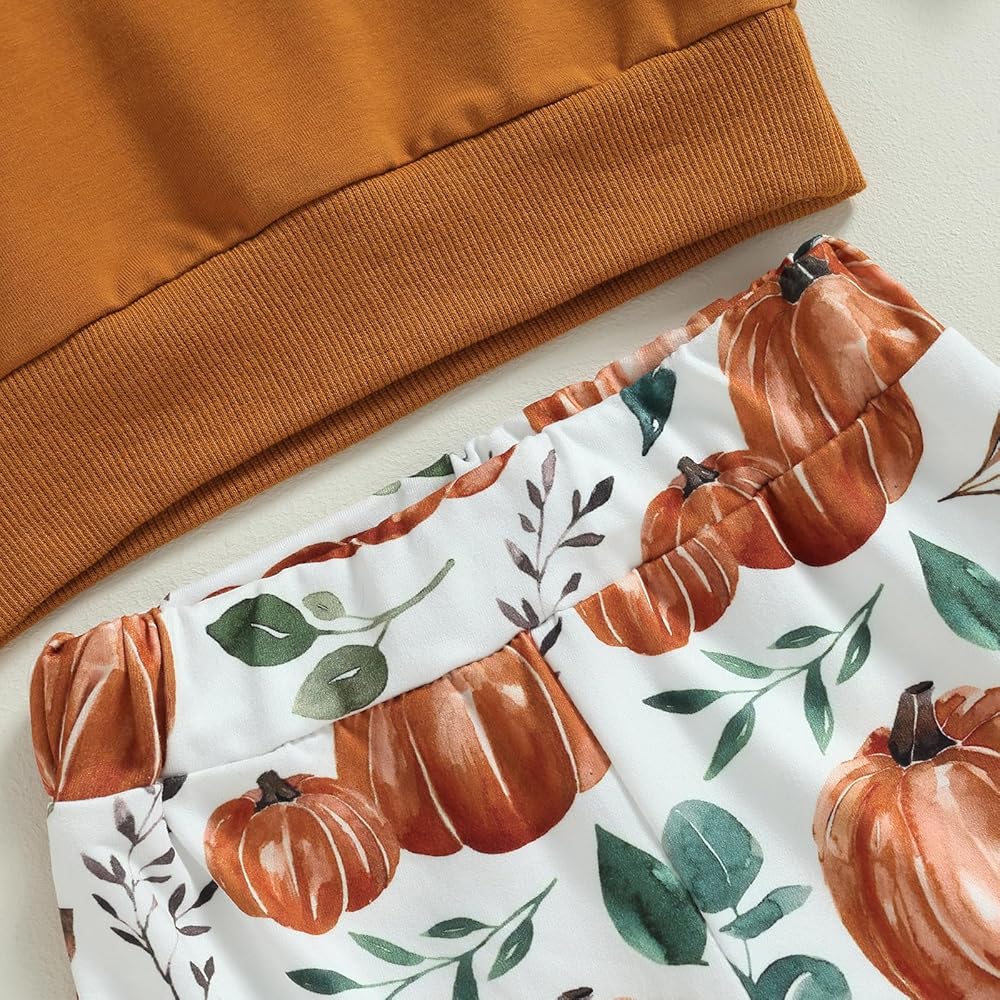 Toddler Baby Girl Halloween Outfit Long Sleeve Sweatshirt Tops Pumpkin Bell-Bottom Pants 2Pcs Fall Clothes Set (Brown,3-4 Years)