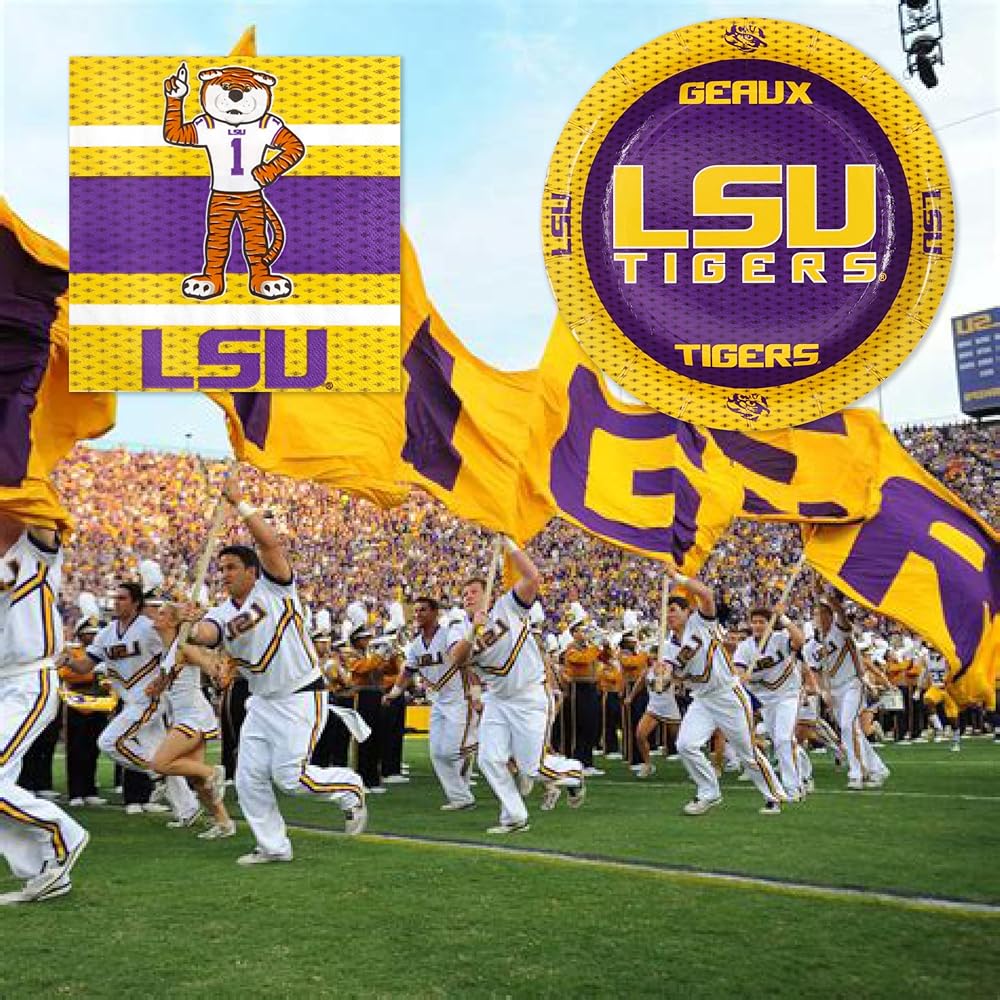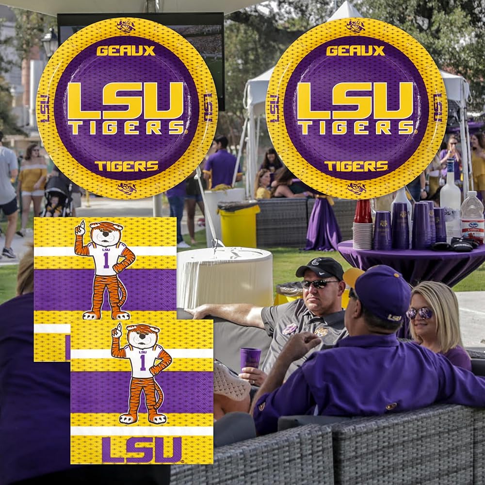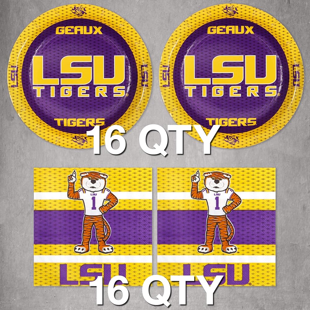 Havercamp LSU Party for 16! Set includes 16 Appetizer Plates & 16 Party Napkins - Featuring LSU Logos and Mike The Tiger - Tailgate, Football Party, Birthday or University events
