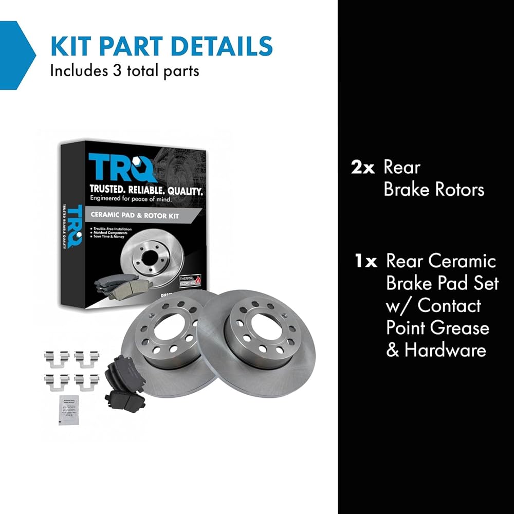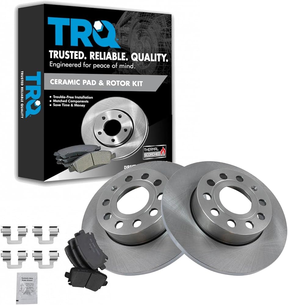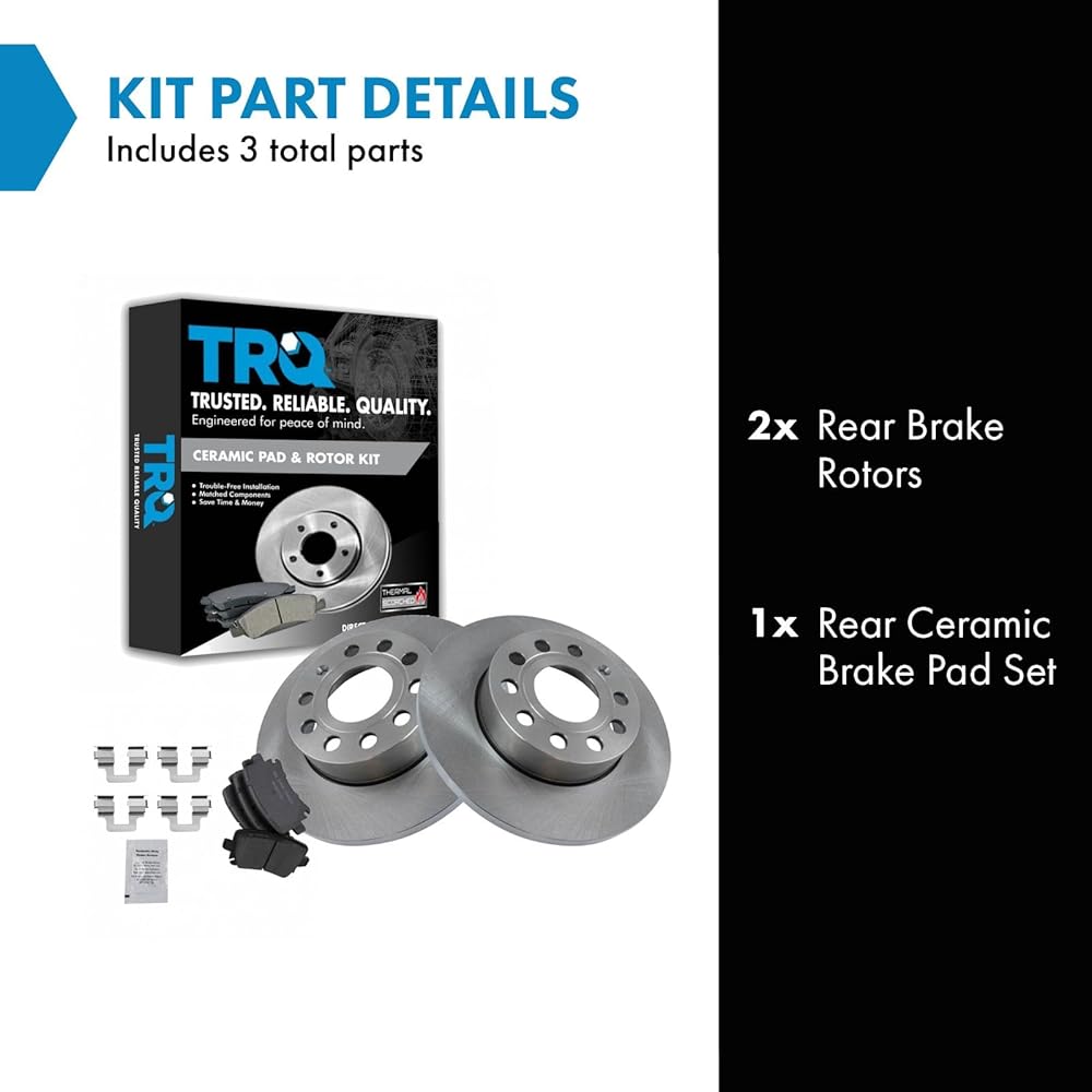 TRQ brake kits are designed to restore your brake system to like-new performance. TRQ brake pads are positive molded, thermal scorched, chamfered, and utilize a multi-layer shim for enhanced performance and service life. TRQ rotors have a non-directional finish that reduces the break-in period for new rotors as well as reducing vibrations throughout the rotor's lifecycle. All products are fit and road-tested in our Massachusetts R&D facility to ensure we deliver on our promise of Trusted Reliable Quality.