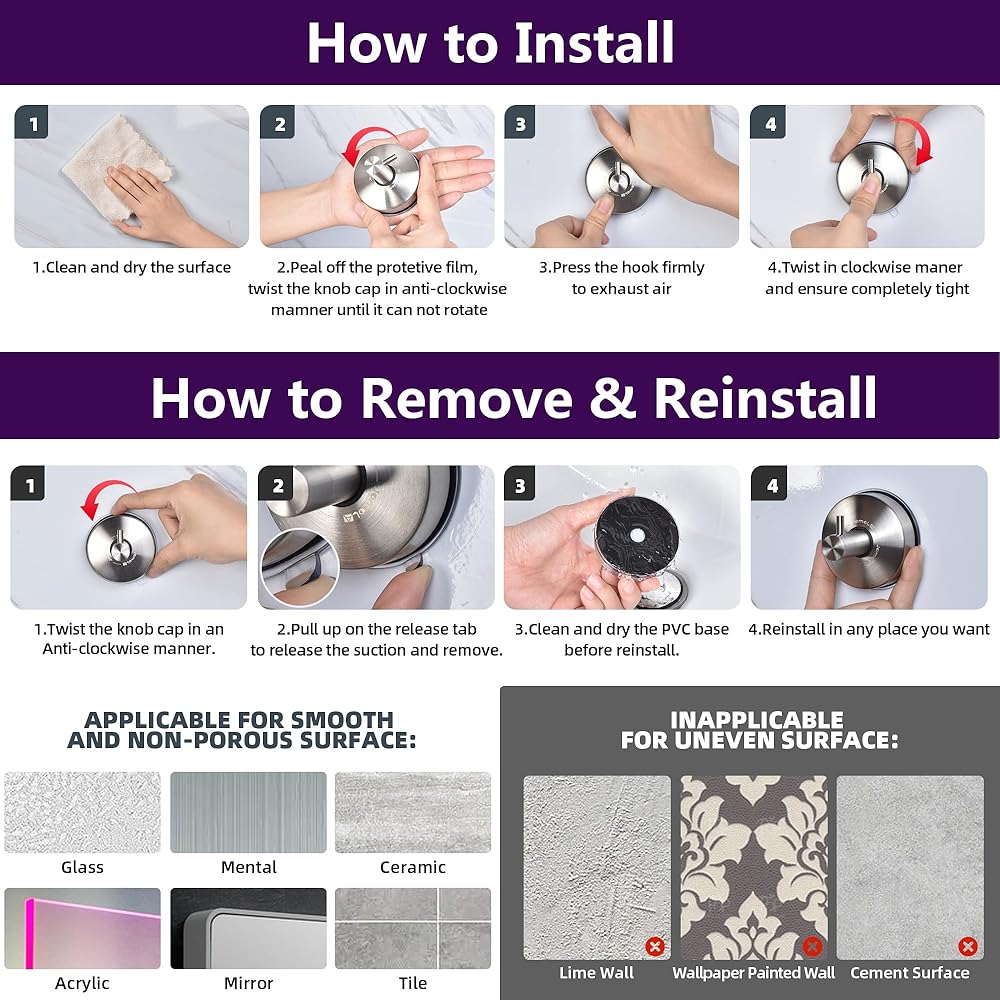 Removable Shower Suction hooks: Bathroom Wall Hooks Hanger for Towel, Bath Robe, Coat, washcloth, shower cap, Loofah. Support for repeated use, simply wash the suction cup by water after removing, then follow the complete installation instructions to reuse it after drying.