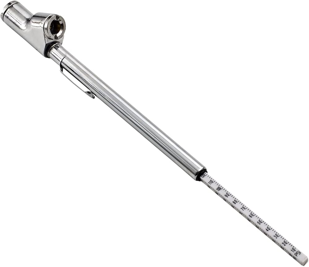 This 6.5 straight-on dual foot tire gauge measures from 10 to 120 PSI and includes a pocket clip.