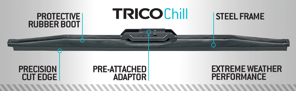 TRICO Chill winter wiper blades are designed for dependable performance when the forecast calls for extreme weather performance. TRICO Chill blades are manufactured using incredibly durable metal encased in a protective boot to prevent ice and snow buildup.
