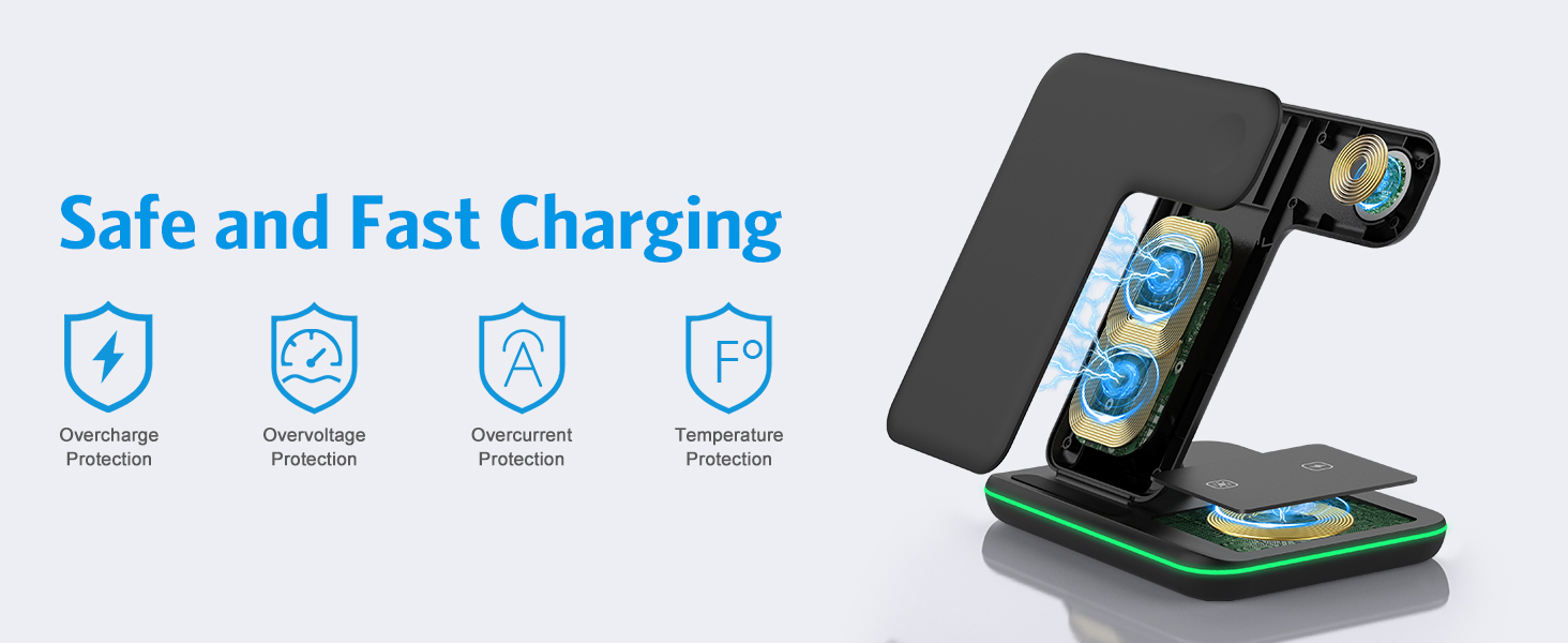 【Safety Protection】With advanced Qi certification, the wireless charging station provides you with a safe charging experience. This charger is equipped with multi-function smart shunt technology, built-in smart chip, which can provide over-voltage protection, over-current protection, short-circuit protection, temperature control, and ventilation holes on the back, to ensure that your device is safely charging.