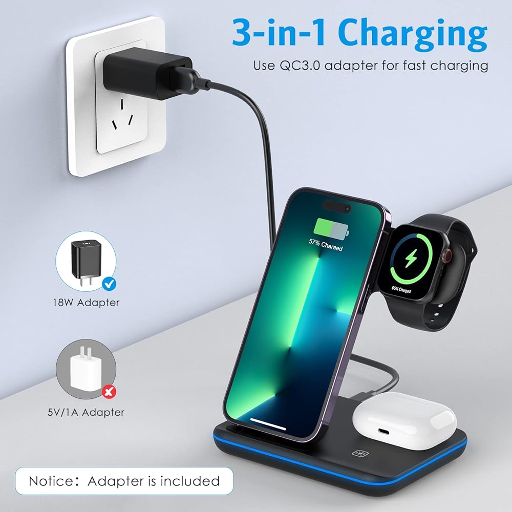 【3 in 1 Wireless Charging Station】The wireless charger can simultaneously charge mobile phones, iwatch and Air pods (with wireless charging case) that support wireless charging. 15W maximum power for mobile phone charging, 2.5W maximum power for headphone charging, 2.5W maximum power for Samsung watch charging, support mixed charging for iPhone and Android phones. (Note: QC 3.0 adapter must be used when charging mobile phones, headphones and watches together (adapter included))
