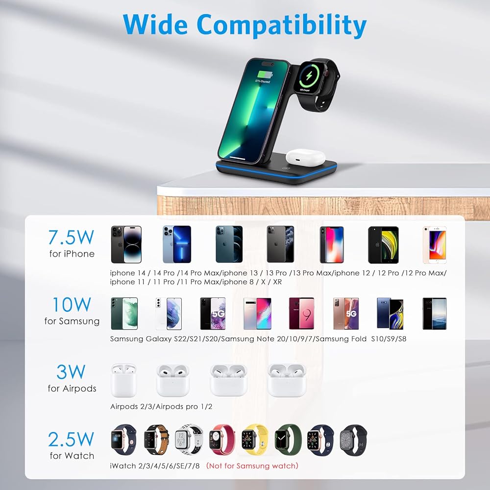 【Universal Compatibility】Supports most popular mobile phones. Suitable for iwatch series 8/Ultra/7/SE/6/5/4/3/2 and Air Pods/Galaxy Buds/TWS (with wireless charging case), iPhone 15/14/12/13/11/XR/XS/8 series, Samsung Galaxy S22/S21/S20/S10/S9/S8/S7 , Note20/10/9/8 and all mobile phones that support wireless charging.