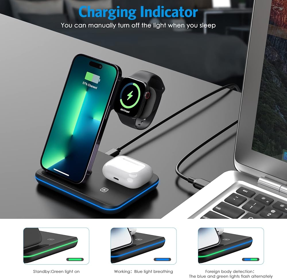Wireless Charger, Criacr 3 in 1 Wireless Charging Station for Apple iPhone 15/14/13/12/11/Pro/Max/XS/XR/X/8/Plus, iWatch, AirPods 3/2/Pro,Travel Charger for Multiple Devices