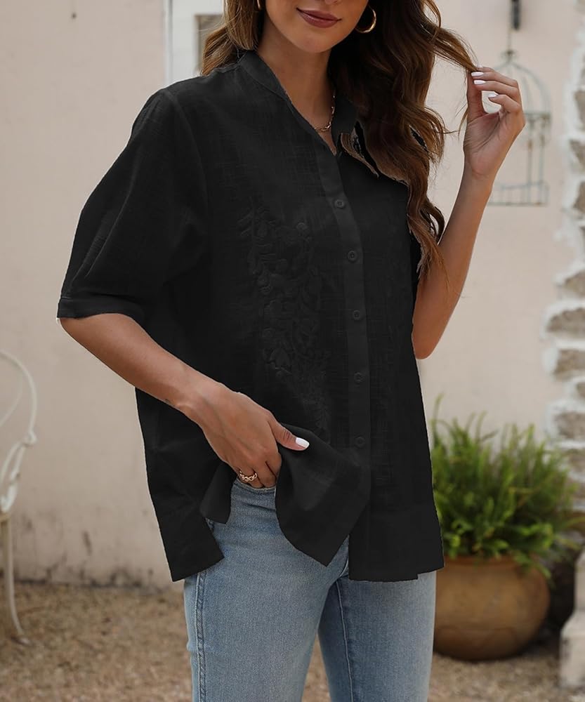 ❤FEATURES: This Casual Button Down Shirt Loose Blouse Belong to Our New Spring Summer Mexican Peasant Blouses Series. The Embroided Blouses for Women Short Sleeve Shirts is With Bohemian Floral Embroidered Around Neckline, Bottom and Shoulder, The Unique Mexican Peasant Embroidered Top Makes You Look Special Among the Crowd.